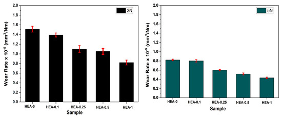 Figure 7. Wear rates of AlCoCrFeNiWx HEAs under 2 N and 5 N applied loads.