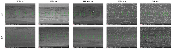 Figure 3 presents the SEM images of all HEAs. In Figure 3a–c, the SEM micrographs of the HEA-0 alloy are shown. The HEA-0 alloy exhibits a single-phase BCC solid solution structure with equiaxed grain morphology. Color differences (gray or white) observed in the planar arrangement of grains are attributed to angular misorientations. EDS analysis revealed no significant differences in the chemical composition of the characterized grains.