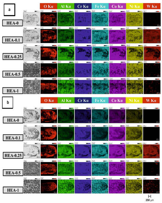 Figure 9. (a) Elemental distribution maps of AlCoCrFeNiWx HEAs under 2N applied load, (b) Elemental distribution maps of AlCoCrFeNiWx HEAs under 5N applied load.