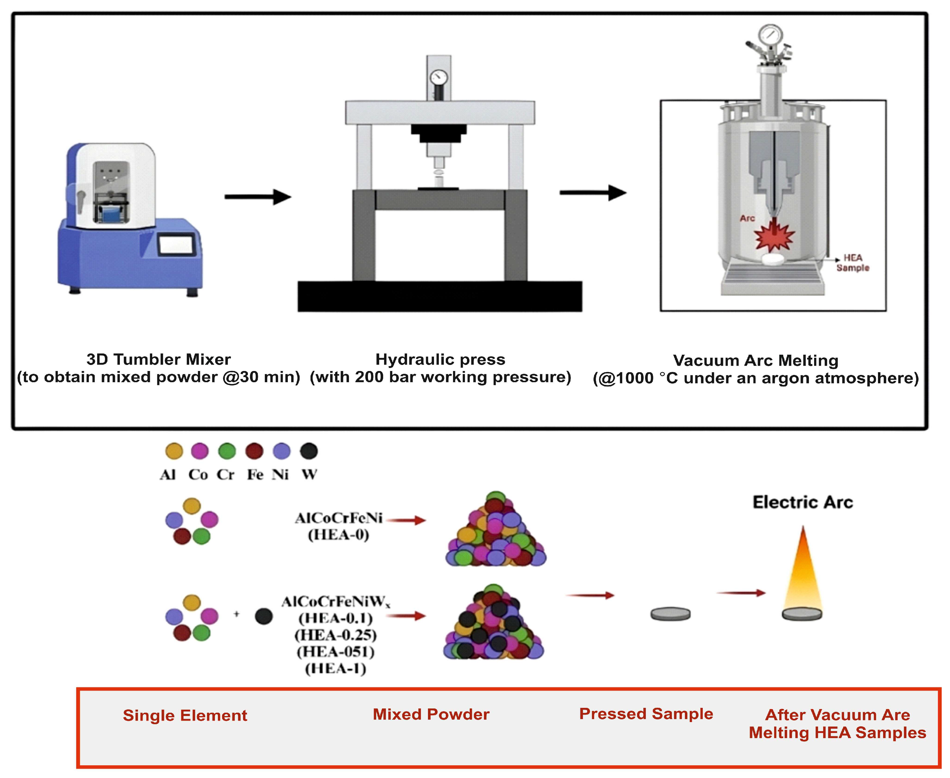 The atomic radii, Pauling electronegativity, and VEC values of the constituent elements used in the synthesized HEAs are presented in