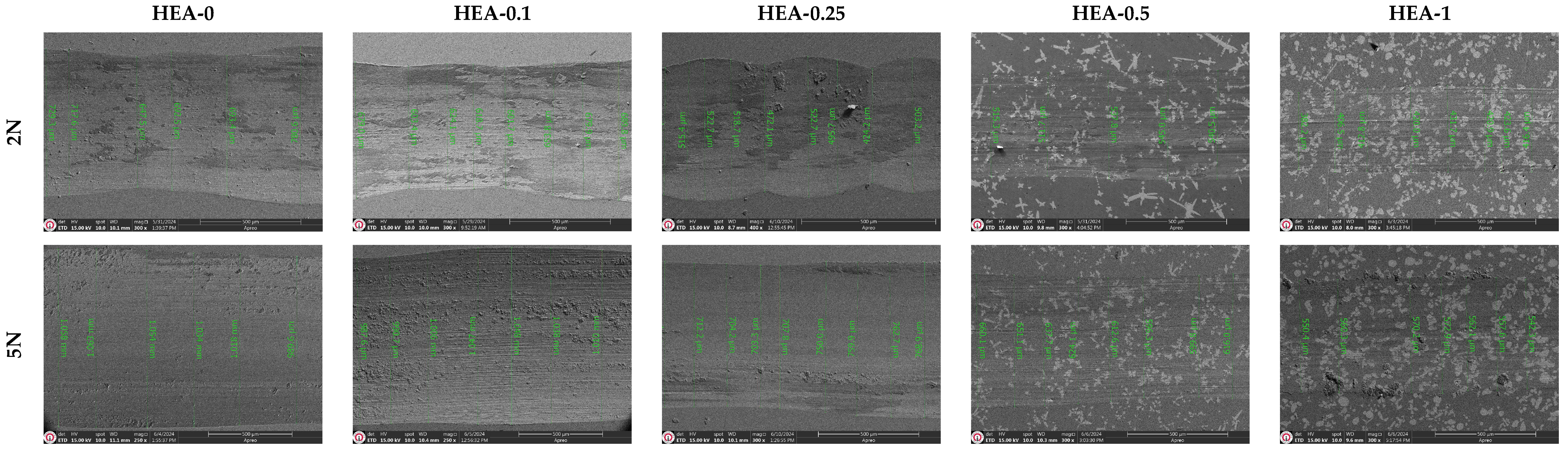 x HEAs obtained under applied loads of 2 N and 5 N. In addition, SEM line analyses were used to determine the wear track widths induced by the alumina ball on the HEAs. Under a 2 N load, the average wear track widths for the HEA-0, HEA-0.1, HEA-0.25, HEA-0.5, and HEA-1 alloys were measured as 755.62 μm, 695.81 μm, 525.13 μm, 520.35 μm, and 411.58 μm, respectively. Under a 5 N load, the wear track widths were measured as 1023.4 μm, 1002.4 μm, 762.36 μm, 648.22 μm, and 549.26 μm, respectively. The increase in applied load leads to a broader contact area at the wear interface, thereby resulting in more extensive surface interactions and enhanced frictional effects. In contrast, wear tracks formed under lower loads tend to be narrower, and the friction-wear relationship exhibits a more linear trend, particularly in matrix structures that are free from particle clusters or elemental segregations. However, features such as grain boundaries, W-rich hard phases, dendritic regions, and spherical morphological accumulations of alloying elements can significantly influence the frictional behavior. For instance, the hard phases present in the microstructure of the HEAs exert an abrasive effect on the contact surface of the counter ball, leading to a gradual transition from its spherical contact geometry to a flatter surface. In such cases, the worn ball material may become partially embedded into the HEA surface, potentially contributing to a reduction in the friction coefficient. This phenomenon may be associated with surface oxidation reactions. Particularly in the HEA-1 alloy, the narrow and shallow wear tracks observed indicate that wear occurs at a significantly low level, which is directly linked to both the microstructural stability and the wear resistance provided by the hard phases. As a result, it has been determined that increasing W content in the fabricated HEAs leads to a decrease in both the coefficient of friction and wear rate, thereby significantly enhancing the overall wear resistance.