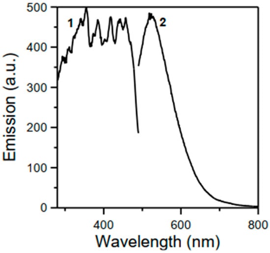 Solid-state, room-temperature excitation (λ/nm, maximum emission at ~520 nm) (curve 1) and emission (maxima excitation at 355, 384, 418, and 457 nm) (curve 2) spectra of H2L. Under excitation by using the four different wavelengths, emission with the same “structure”, and intensity was always recorded.