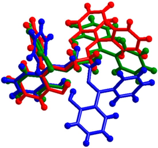 Overlay presentation of the three N1⋯N2 (present study, H2L(B), red)-, N11⋯N12 (H2L(A), blue)-, and N21⋯N22 (H2L(A), green)- containing molecules in the two polymorphs H2L(A) and H2L(B).