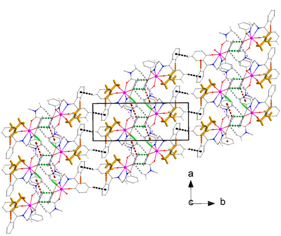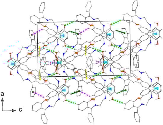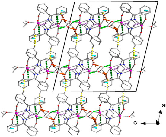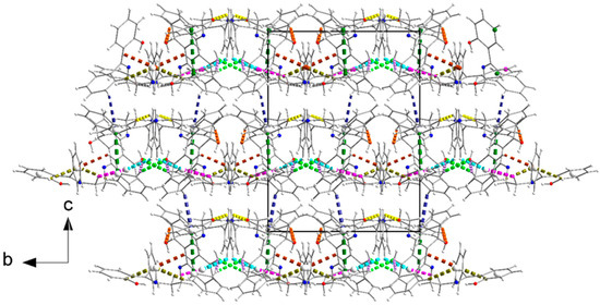 The 3D architecture of the structure of H2L(A) [50]. Dashed orange, violet, light green, pink, brown, yellow, cyan, gray, and dark yellow lines represent the C113-H113⋯O21, C213-H213⋯O11, C226-H226⋯O11i, C215-H21D⋯Cg1*, C15-H15⋯Cg2**, C119-H119⋯O12ii, C121-H121⋯Cg1*ii, C219-H219⋯O22iii,and C29-H29⋯Cg2**iv intralayer interactions, respectively. The π-π interactions are indicated with dashed dark green lines. The C210-H210⋯Cg3*** interlayer interactions are indicated with dashed indigo lines. Cg1*, Cg2**, and Cg3*** are the centroids of the C11C12…C16, C217C218…C222, and C123C124…C128 rings, respectively. Symmetry codes: I x, −1 + y, z; ii −0.5 + x, 0.5 − y, z; iii 0.5 + x, −0.5 − y, z; iv −0.5 + x, −0.5 − y, z. Geometrical parameters are listed in Table S2.