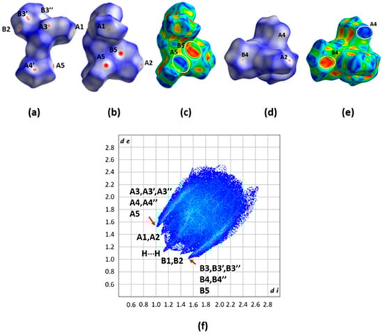 All the types of interactions discussed above are also clearly seen on the dnorm Hirsfeld surface (HS) representations (Figure 8a,b,d). On the Shape decorated HS, the characteristic complementary red (concave) and blue (convex) areas characteristic of the C-H⋯π interactions are present (Figure 8c,e). The drawing f in the same figure shows the fingerprint plot for the structure of H2L(B).