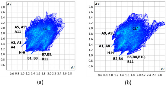 All the types of interactions mentioned above are also clearly seen on the dnorm or Shape decorated HSs (Figure 11). On the Shape decorated HS, the characteristic complementary red (concave) and blue (convex) areas characteristic of C-H⋯π interactions are present (Figure 11c–e,g,i,l–n). In drawings c and g of this figure (areas indicated with C6 and C6′ labels), the diagnostic blue and red triangles of the π⋯π interactions are visible.