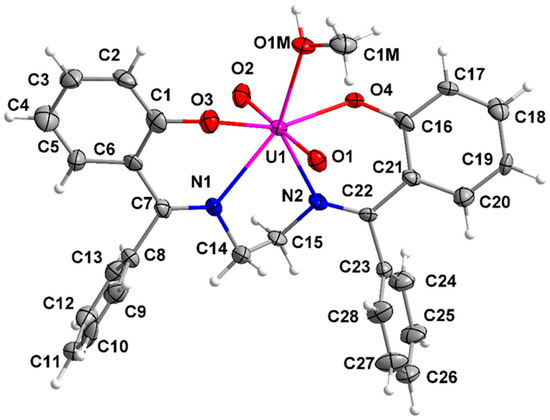 Fully labeled, ORTEP-type plot of the molecular structure of [UO2(L)(MeOH)] (1). Displacement ellipsoids are drawn at the 50% probability level.