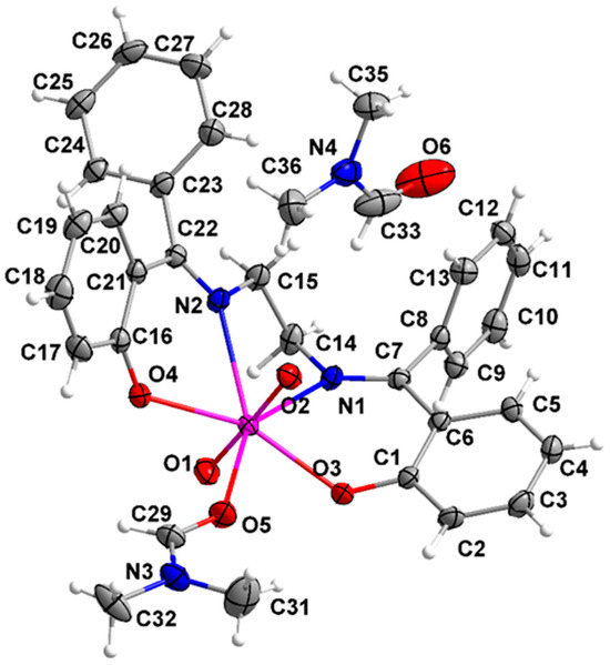 The solution behavior of an analytically pure sample of 2·DMF (i.e., 2) is different and most probably the solid-state structure is retained in both chloroform and dimethylsulfoxide. In agreement with this, solutions of 2 in DMSO are non-conductive (vide supra). The -OH signals are lacking in the 1H NMR spectra of the complex in d6-DMSO and CDCl3 (despite the poor quality of the latter), indicating that the ligand is deprotonated. The spectra clearly show the DMF signals. The -CH- proton appears as a singlet resonance at δ 8.10 (CDCl3) and 7.95 (d6-DMSO) ppm, while the expected two singlet signals for the -CH3 protons are visible at δ 2.98, 2.93 (CDCl3) and 2.89, 2.73 (d6-DMSO) ppm. The corresponding 13C NMR signals in d6-DMSO are at δ 163.23 (-CH-) and 36.25, 31.55 ppm (-CH3). The fact that the 1H and 13C NMR -CH- and -CH3 resonances of DMF in the spectra of the complex appear at almost identical δ values with those of free DMF in d6-DMSO [76] might indicate the replacement of the coordinated solvent molecule by a d6-DMSO molecule; this is reasonable given the large excess of the deuterated solvent in the NMR tube. Moreover, the 1H and 13C NMR signals of 2 have been shifted compared to those in H2L (and 1) due to the deprotonation and coordination of the Schiff base [68]. Additional evidence for the retainment of the structure of 2 in CHCl3 (data in DMSO are not available) is the orange color of the solution and the ligand-to-metal charge-transfer transition at ~500 nm in its UV-Vis spectrum; this band also appears in the solid-state UV-Vis spectrum of 1 (vide supra).