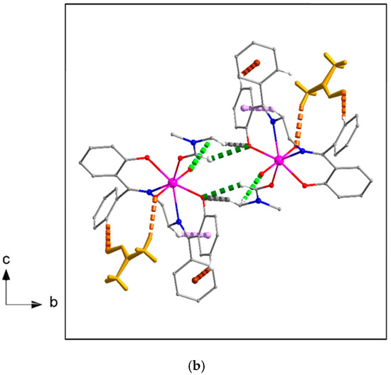 Views of the molecular structure of H2L(B) (space group Pbca) are presented in Figure 4 and Figure S7. The structures of the two independent molecules of H2L(A) (space group Pna21) [50] are shown in Figure 5. In our compound, the C7-N1 and C16-N2 bond lengths (1.289(2) and 1.288(2) Å, respectively) are indicative of double carbon–nitrogen bonds, whereas the C14-N1 and C15-N2 distances (1.463(2) and 1.472(2) Å) clearly suggest single bonds. The C1-O1 and C28-O2 bonds are single, as evidenced by the corresponding distances of 1.342(2) and 1.355(2) Å. There are two strong intramolecular H bonds with the phenol oxygen atoms (O1, O2) as donors and the imino nitrogen atoms (N1, N2) as acceptors; their dimensions are O1⋯N1 2.537(2) Å, H1⋯N1 1.57(2) Å, O1-H1⋯N1 147.2(2)°, and O(2)⋯N2 2.541(2) Å, H2⋯N2 1.56(2) Å, O(2)-H2⋯N2 151.1(2)°. The angle between the planar C1C2C3C4C5C6 and C23C24C25C26C27C28 phenol rings is 74.4°. As a result, the four potentially donor atoms (O1, O2, N1, N2) deviate significantly from their best mean plane, i.e., by 0.418 (O1), 0.235 (O2), 0.748 (N1), and 0.566 (N2) Å.
