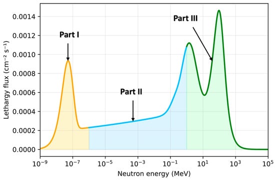 The neutron is an electrically neutral subatomic particle belonging to the baryon family. It has a slightly greater mass than the proton and is unstable in its free state, with a half-life of around 880 s [59]. Its electrical neutrality enables it to penetrate deep into matter, with which it mainly interacts via the strong nuclear force. Atmospheric neutrons are an essential component of secondary cosmic radiation reaching the Earth’s surface. They originate from primary cosmic rays, which are mainly composed of protons (around 85%), alpha particles (around 12%) and heavy nuclei [60]. When they enter the Earth’s atmosphere, these primary cosmic rays interact with nitrogen and oxygen nuclei, producing a hadronic cascade of secondary particles: pions, kaons and nucleons. Neutrons are released primarily through two mechanisms: (i) in direct nuclear reactions involving cosmic protons and atmospheric nuclei, and (ii) through the decay of neutral pions and kaons formed in these reactions [61]. An extremely broad energy spectrum is covered by these secondary neutrons, ranging from thermal neutrons (<10−2 eV) to high-energy neutrons (>109 eV) [62]. The average flux of cosmic neutrons at ground level is in the order of a few tens of neutrons/cm2/h [62]. The spectrum of atmospheric neutrons at ground level, shown in Figure 1, has three main peaks. The first one is a thermal peak, which corresponds to neutrons that have been slowed down through scattering until they reach thermal equilibrium with the surrounding materials [62]. The second peak is a so-called “nuclear evaporation” peak, centered around 1 or 2 MeV. The third peak is a high-energy peak, centered at around 100 MeV. Between the thermal and evaporation peaks, there is a plateau region in which the differential flux is approximately proportional to 1/E. Experimental measurements using ground-based detectors (such as a Bonner multisphere spectrometer) by Golhagen [63] and Gordon et al. [62] have confirmed this spectral structure. As illustrated in Figure 1, the atmospheric spectrum at sea level can be subdivided into three main parts: Part I relates to thermal and epithermal neutrons with energies below 1 eV; Part II relates to neutrons with intermediate energies between 1 eV and 1 MeV; and Part III relates to high-energy neutrons with energies above 1 MeV. Integrating this spectrum yields the total neutron flux, expressed as neutrons per square centimeter per hour; this flux is approximately 7.6 neutrons/cm2/h for Part I, 16 neutrons/cm2/h for Part II, and 20 neutrons/cm2/h for Part III.