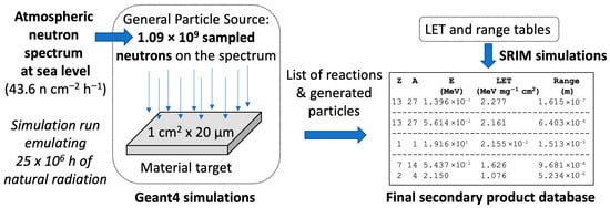 The Geant4 Monte Carlo transport code [71,72] was used to simulate interactions between atmospheric neutrons and the materials studied in this work. Figure 2 summarizes the procedure used in this simulation.