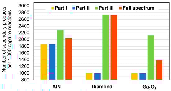 To go further, we only considered capture reactions for each material (eliminating elastic and inelastic reactions that produce a single secondary product). Figure 5 shows the number of secondary products generated in 1000 capture reactions for the three materials. Diamond clearly shows a much higher number of secondary products, particularly in Part III and across the entire spectrum, with nearly 2800 products per 1000 reactions. AlN has more moderate values, ranging from 1800 to 2200 depending on the Part of the spectrum, while β-Ga2O3 has the lowest results. In Parts I and II, AlN has the highest number of products, due to the 14N(n,p)14C reactions, as explained above.