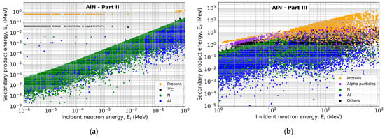 Energies of secondary products generated in AlN by interaction with neutrons from Parts II and III of the atmospheric spectrum as a function of the incident neutron energy: (a) Part II; (b) Part III; the other products in this figure correspond to secondary products with a Z greater than 2.