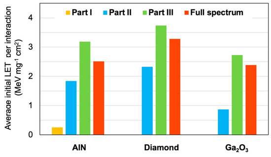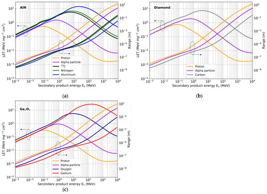 Using the complete list of secondary products resulting from all neutron interactions with each of the three materials, as well as their initial energy, we obtained the initial LET and the range in the different materials for each product. These quantities were calculated using the SRIM code [51,52], as explained in Section 2.4. For each material, we considered the protons, alpha particles, and the nuclei of the atoms that enter into the composition of each material target (Al and N for AlN, C for diamond, and Ga and O for β-Ga2O3). In the case of AlN, we also studied the 14C nucleus, which results from the specific reaction 14N(n,p)14C. It is important to note that the analysis of LETs and ranges does not consider secondary products with energies below 1 eV, since these products cannot deposit enough energy to cause errors in devices and circuits.