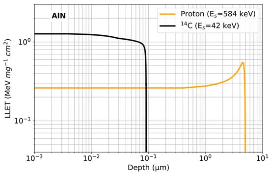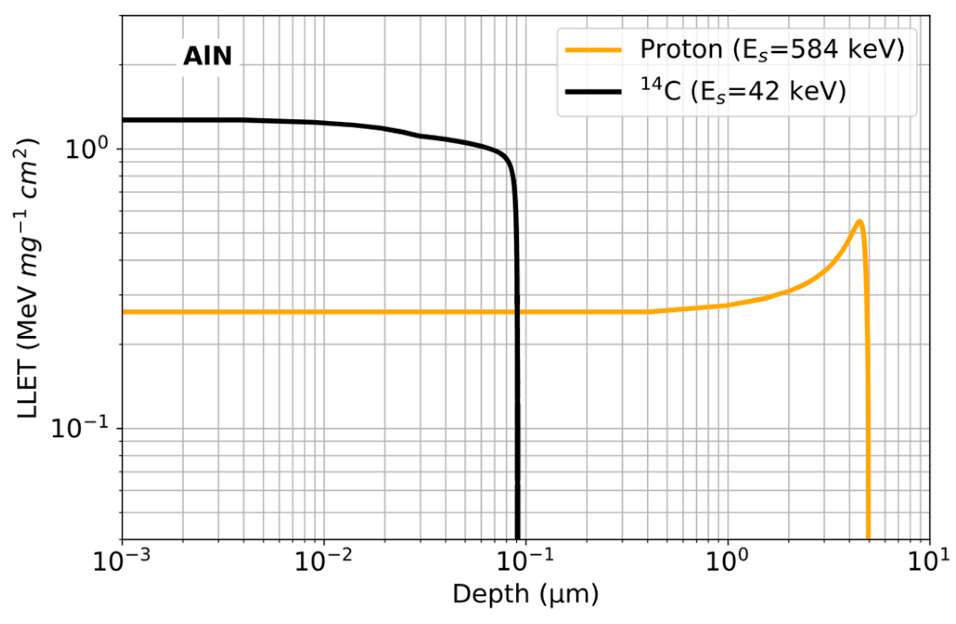 Linear energy transfer (LET) as a function of depth in AlN for a proton of 484 keV and a 14C ion of 42 keV produced in a neutron reaction with a nitrogen atom (14N(n,p)14C reaction).