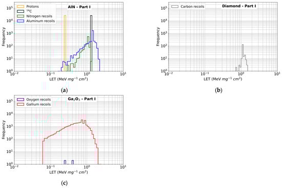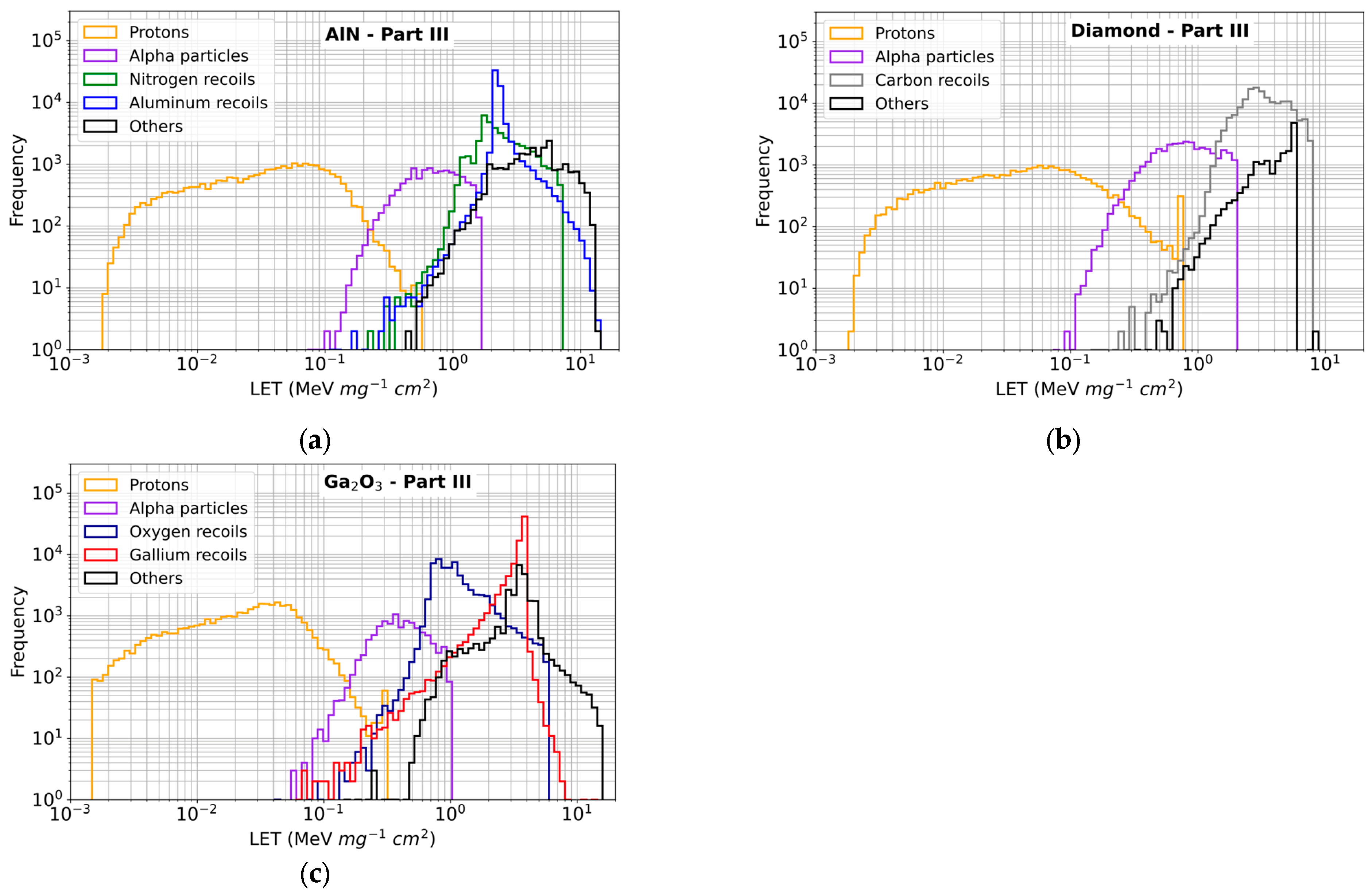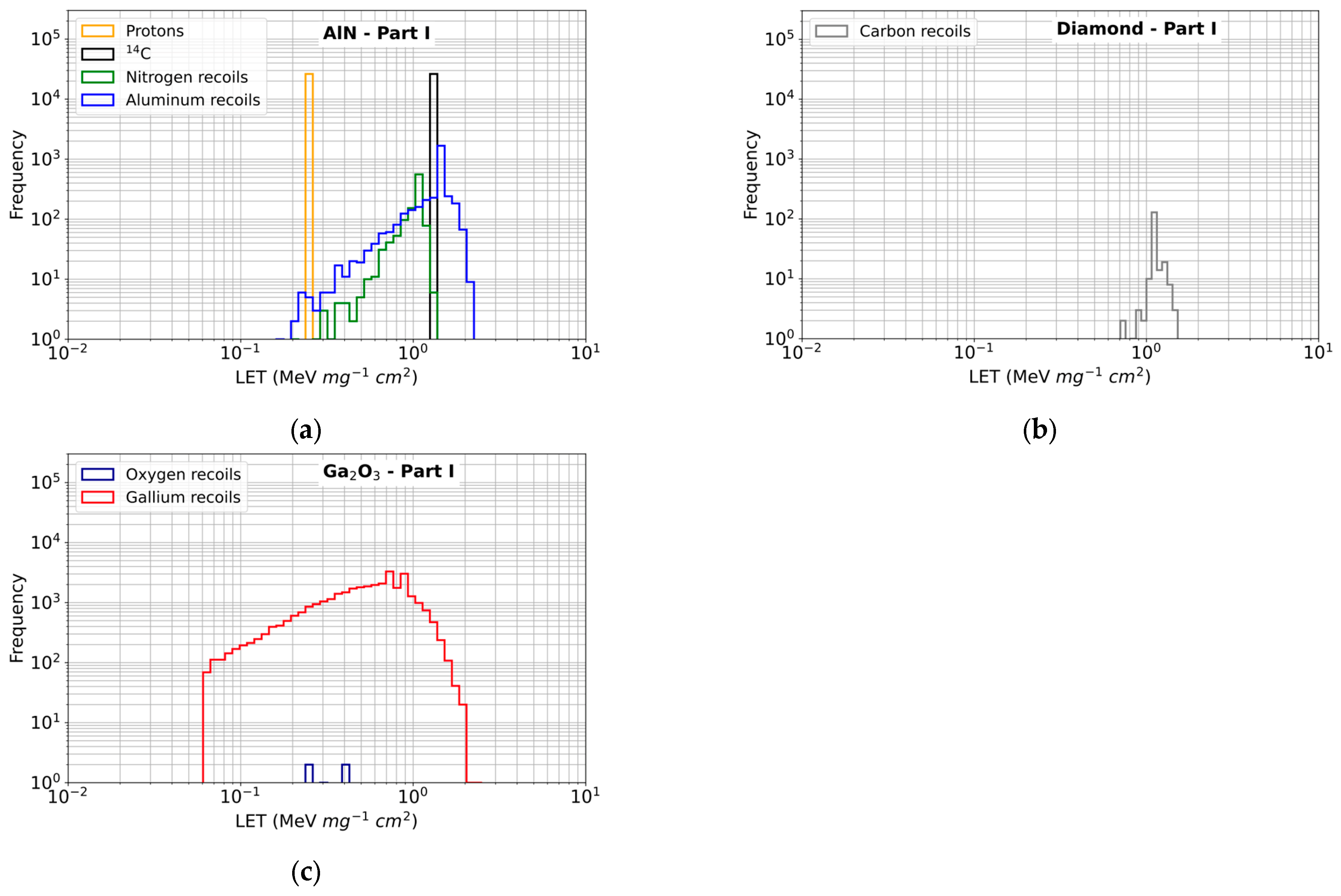 Initial LET histograms for secondary products generated in the material targets by interactions of neutrons with energies in the Part I of the spectrum. (a) AlN; (b) Diamond; (c) β-Ga2O3.