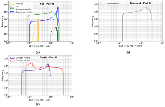 Figure 12 and Figure 13 show the LET and the range histograms of all the secondary products resulting from the reactions between neutrons in Part I of the spectrum and the three materials studied. In AlN (Figure 12a), the secondary products have LETs that cover a relatively wide range of values, from 0.1 to 2 MeV mg−1 cm2. Protons have a relatively low LET, around 0.25 MeV mg−1 cm2. Nitrogen nuclei cover a wider range, centered between 0.3 and 1 MeV mg−1 cm2. The LET values of aluminum nuclei range from 0.2 to 2 MeV mg−1 cm2, while 14C ions produced by the 14N(n,p)14C reaction reach a LET of about 1.3 MeV mg−1 cm2. For diamond (Figure 12b), the only products observed are carbon nuclei. Their LET is concentrated within a narrow range, between about 0.7 and 1.5 MeV mg−1 cm2. This indicates a simpler secondary spectrum than that of AlN, but with particles that locally deposit relatively significant energy. For β-Ga2O3 (Figure 12c), the production is dominated by gallium nuclei, whose LET extends from 0.06 to about 2 MeV mg−1 cm2, with a high frequency around 0.5–1 MeV mg−1 cm2. Oxygen nuclei, which are much less numerous, have more dispersed values within the same range. Looking at the range, in AlN (Figure 13a) the protons resulting from the 14N(n,p)14C reaction have a very long range of around 5 μm, as has been shown previously. On the contrary, the 14C ions produced in the same reaction have very short ranges of around 90 nm. The ranges of N and Al nuclei are mainly between 0.2 nm and 40 nm, reflecting very localized energy deposits. In diamond (Figure 13b), the carbon nuclei show very low ranges, between 0.7 nm and 8 nm, with a narrow distribution, which illustrates the very localized nature of the interactions. Finally, in β-Ga2O3 (Figure 13c), gallium recoils have very small ranges between 0.1 nm and 3 nm. Oxygen recoils have ranges around 1 nm.