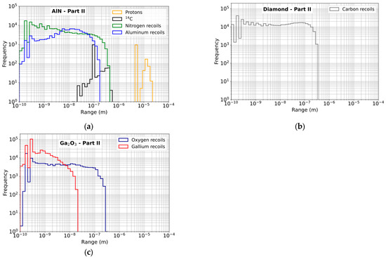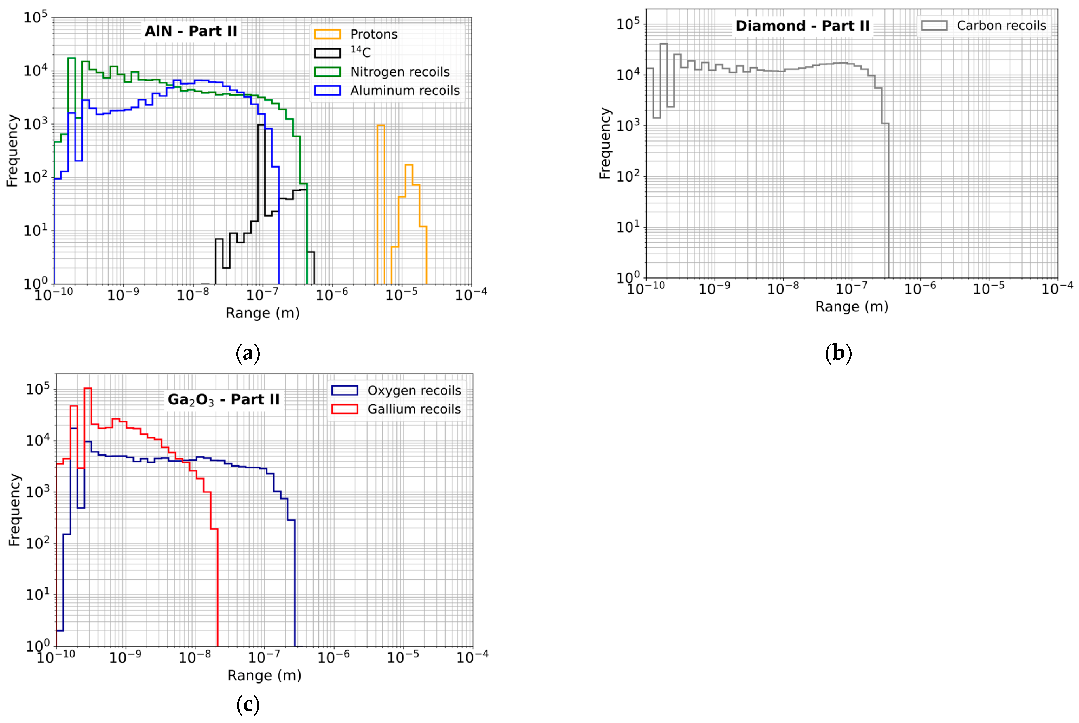 Range histograms (100 bins) for secondary products generated in the material targets by interactions of neutrons with energies in the Part II of the spectrum. (a) AlN; (b) Diamond; (c) β-Ga2O3.