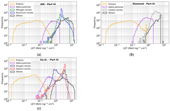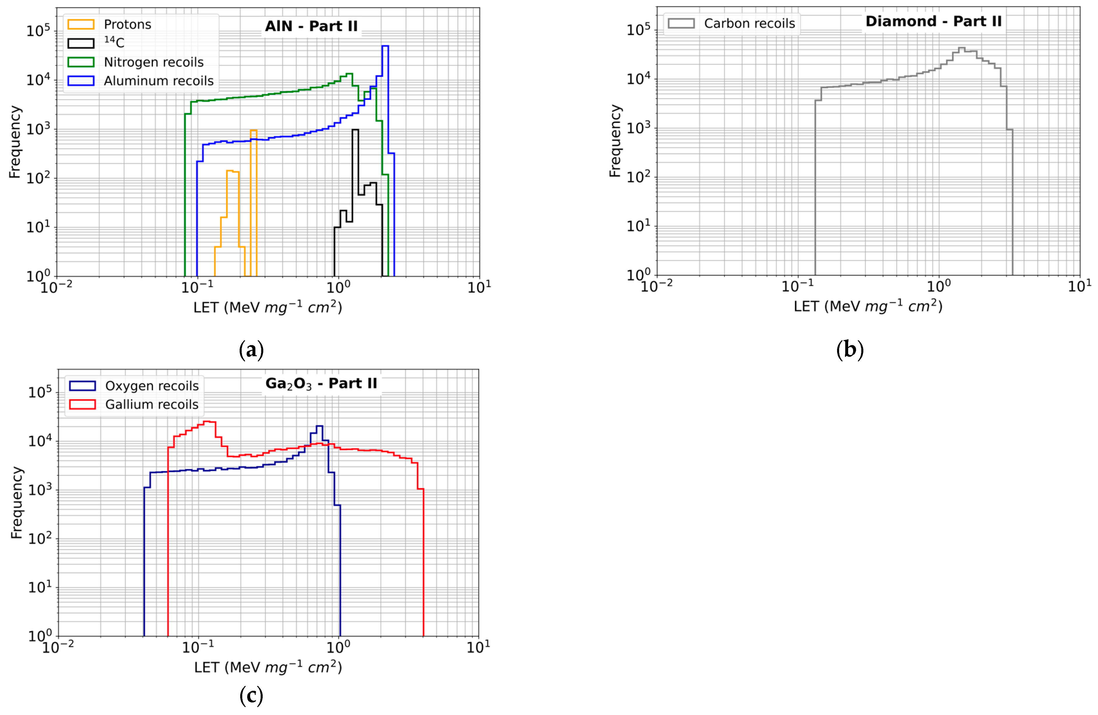 Initial LET histograms (100 bins) for secondary products generated in the material targets by interactions of neutrons with energies in the Part II of the spectrum. (a) AlN; (b) Diamond; (c) β-Ga2O3.
