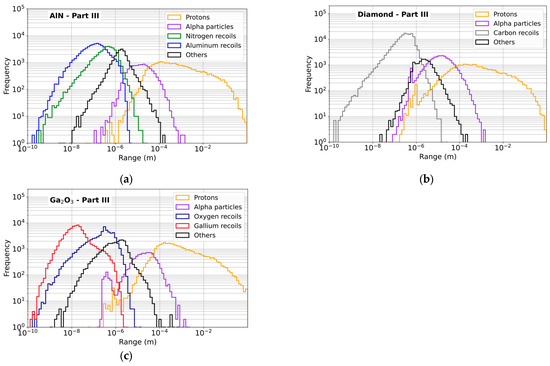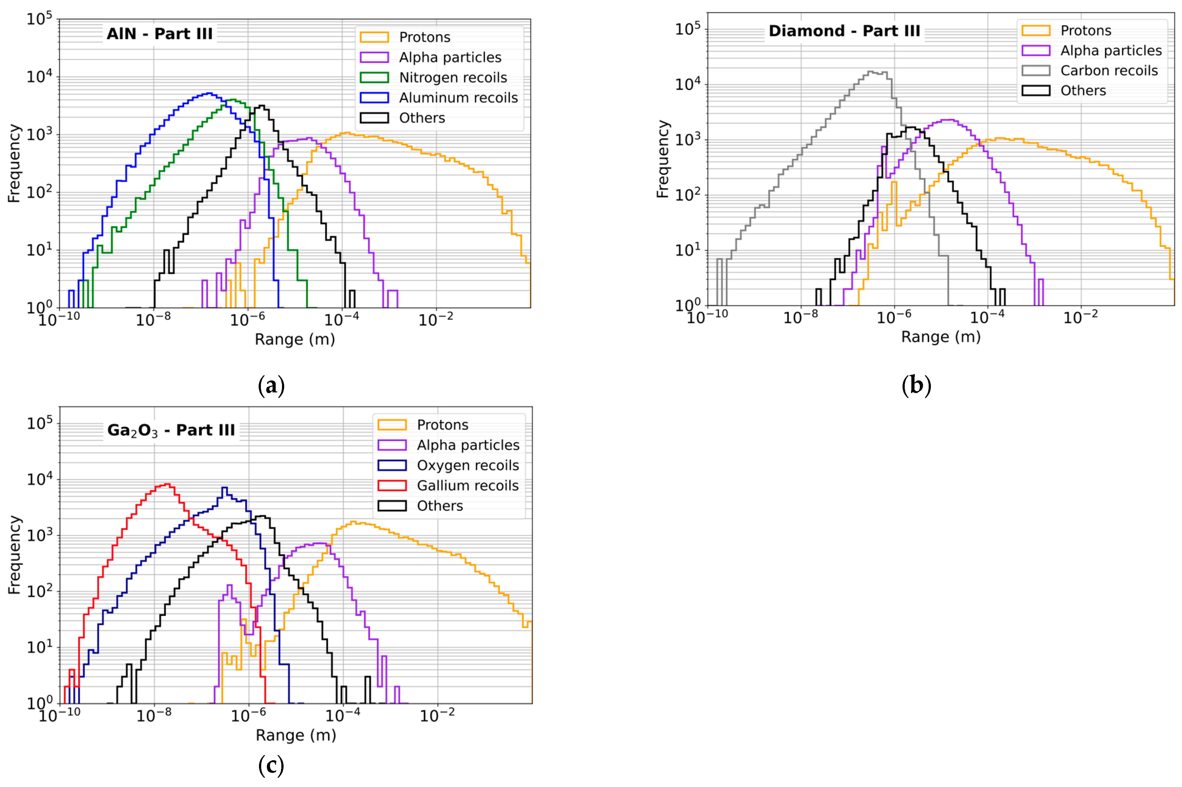 Range histograms for secondary products generated in the material targets by interactions of neutrons with energies in the Part III of the spectrum. (a) AlN; (b) Diamond; (c) β-Ga2O3.
