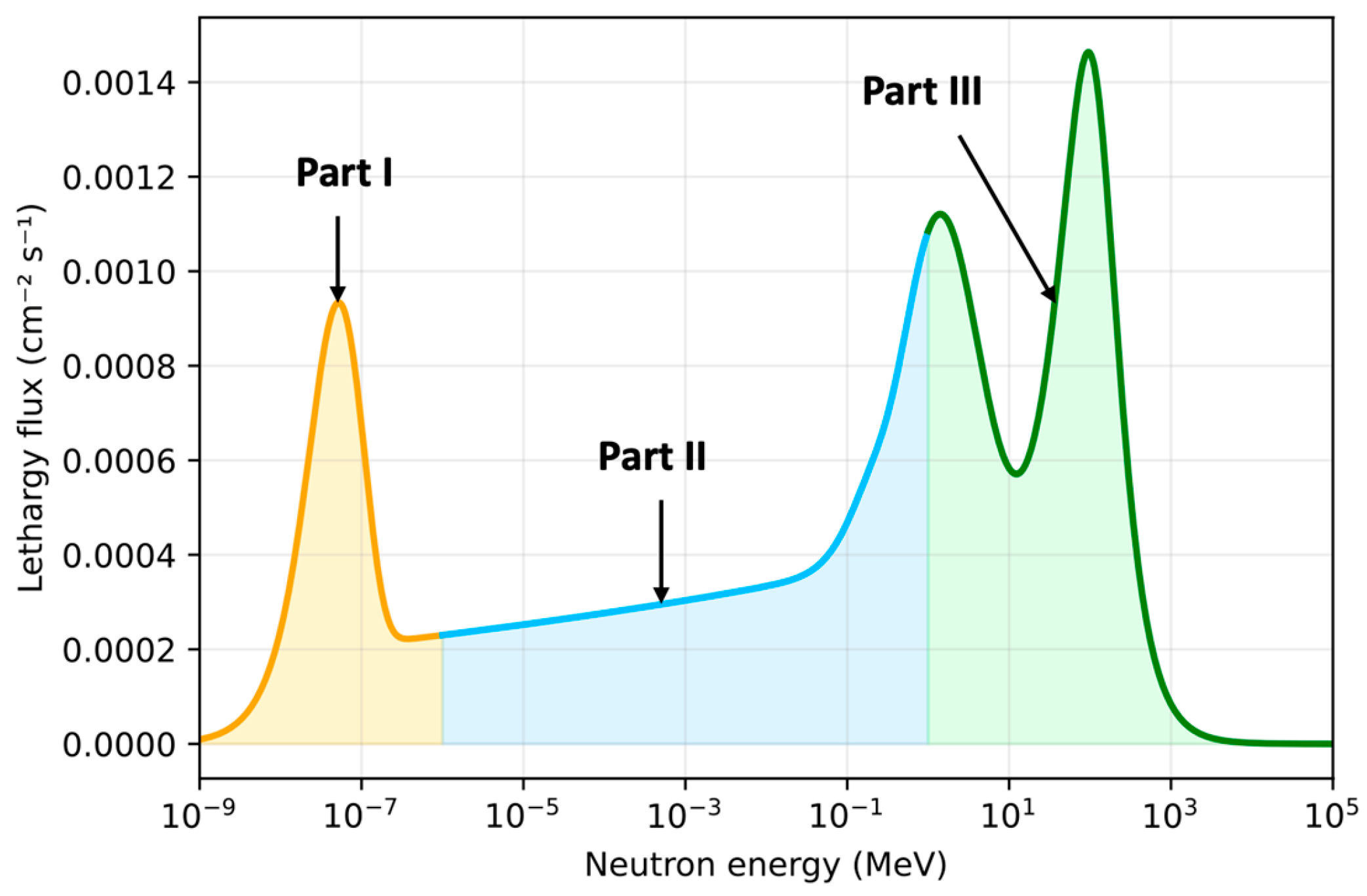 Complete spectrum of atmospheric neutrons at sea level, divided into three parts: Part I for neutron energies below 1 eV, Part II for intermediate-energy neutrons (between 1 eV and 1 MeV) and Part III for high-energy neutrons (above 1 MeV). The lethargy flux is equal to the product of the differential flux (MeV−1 cm−2 s−1) by the energy (MeV).