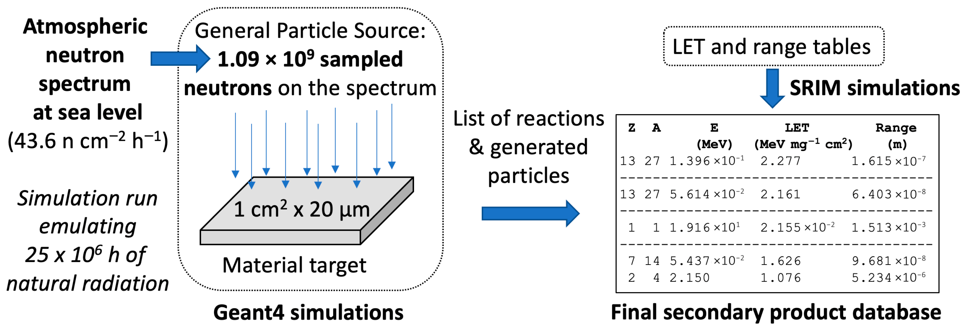 Schematics of the general principle of the simulation procedure used in this work to study neutron-material interactions, as well as the secondary products resulting from these interactions.
