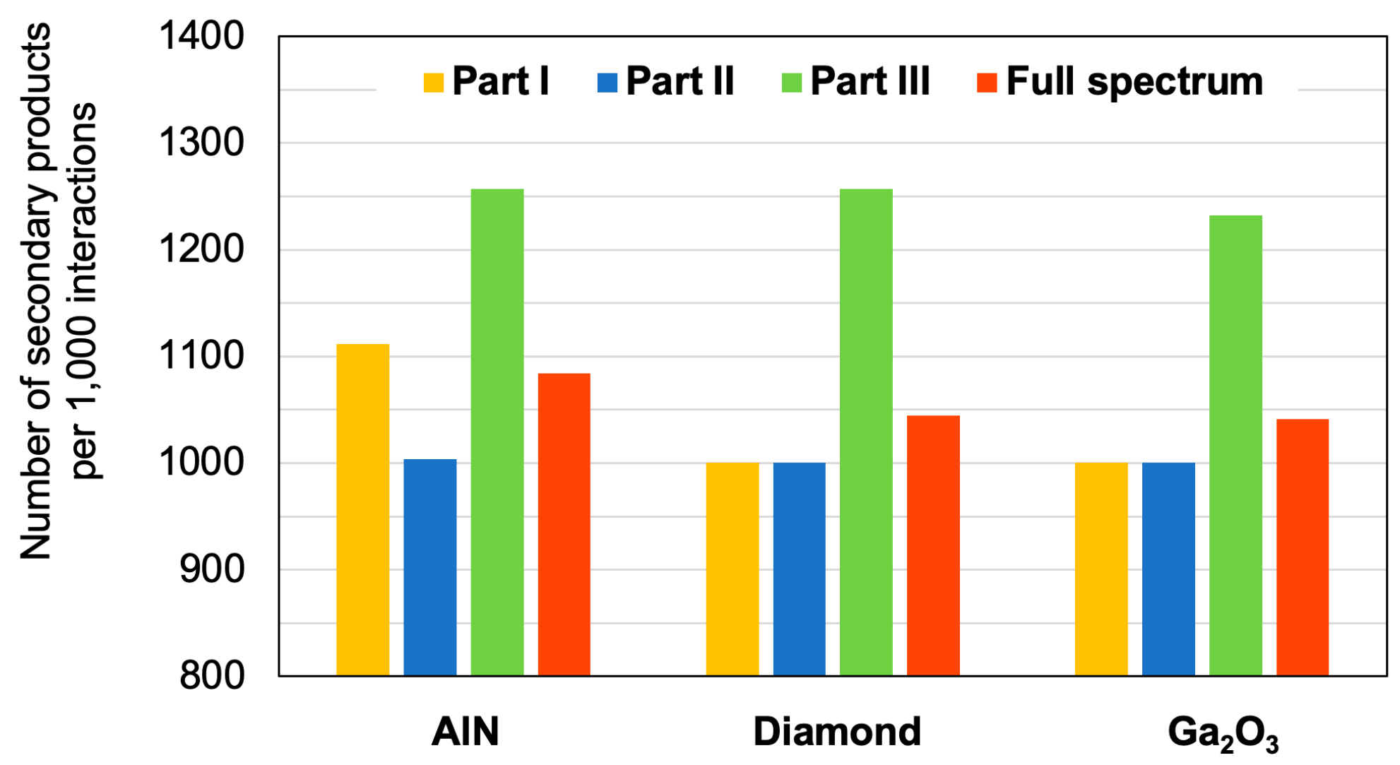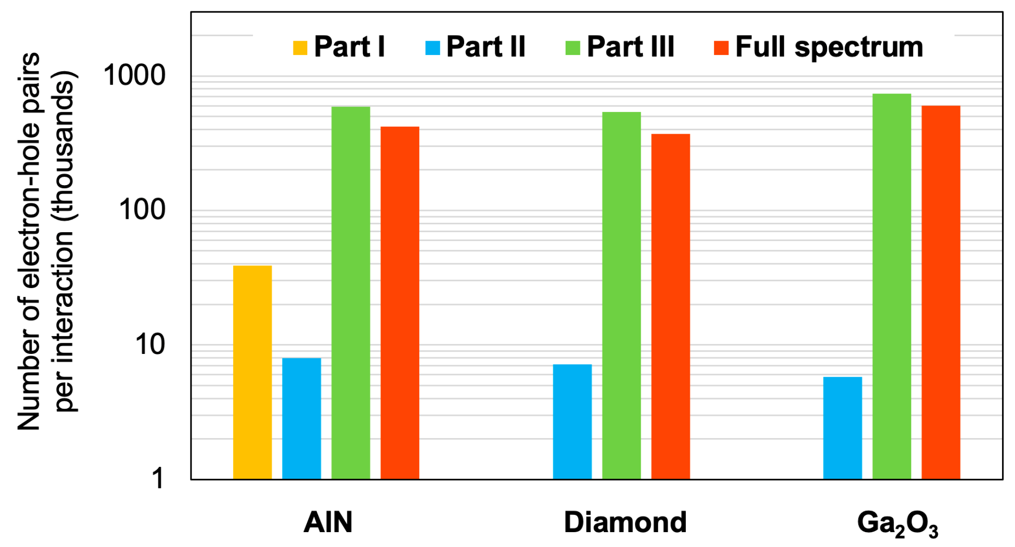Average number of electron-hole pairs per interaction for Parts I, II, III and the full spectrum by secondary products in AlN, diamond and β-Ga2O3 bulk targets. Only secondary products with initial energies above are taken into account.