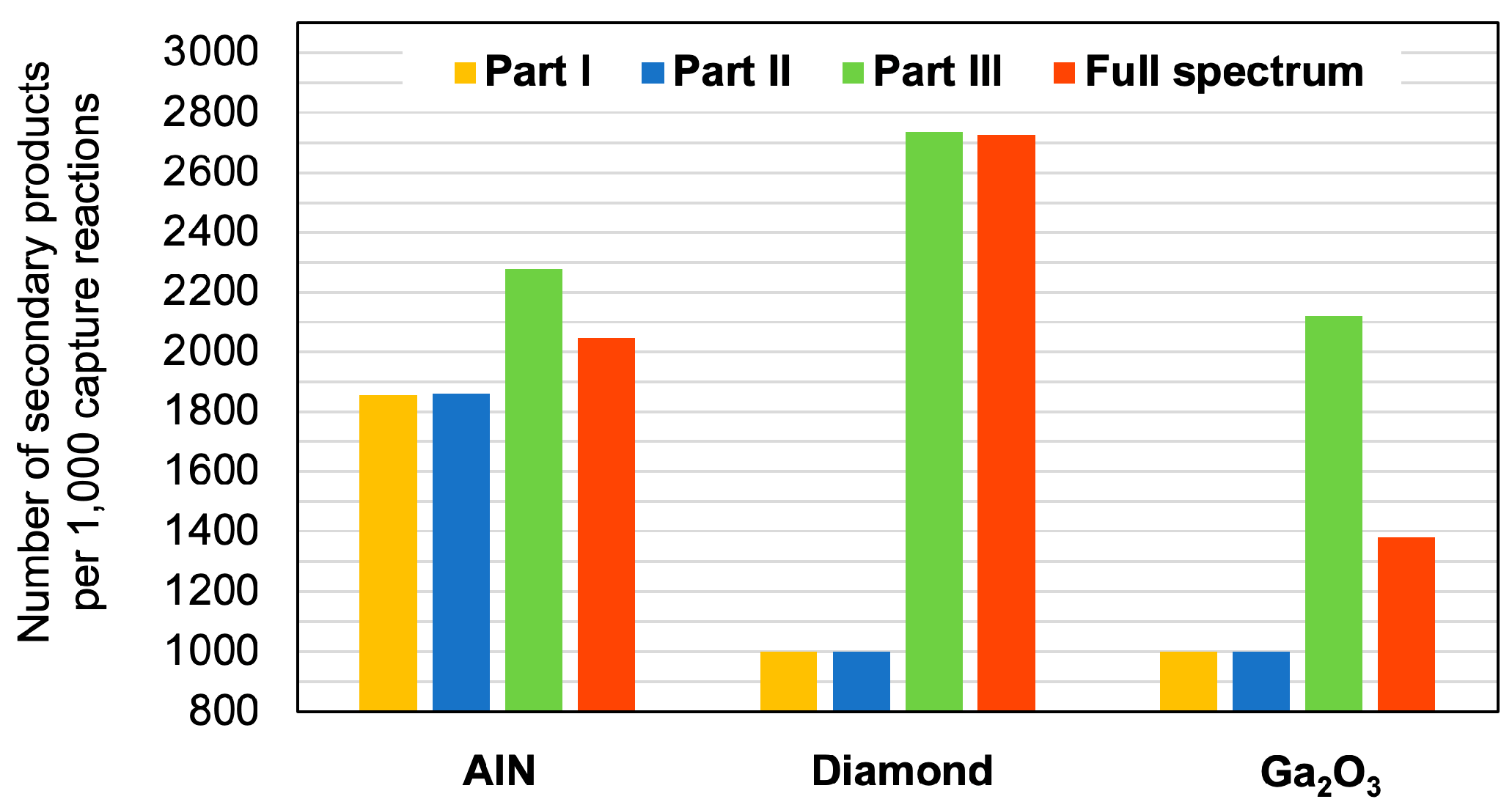 Number of secondary products per 1000 capture interactions of neutrons with AlN, diamond and β-Ga2O3 for the three energy domains and the full atmospheric spectrum.