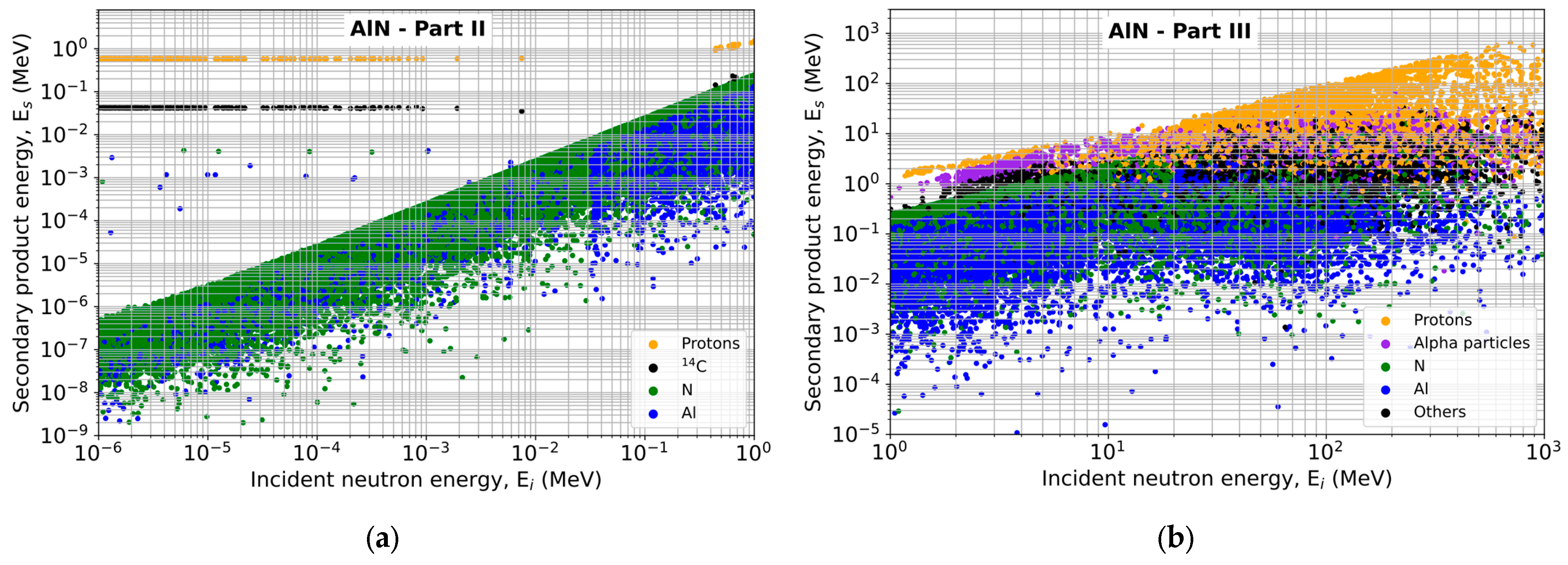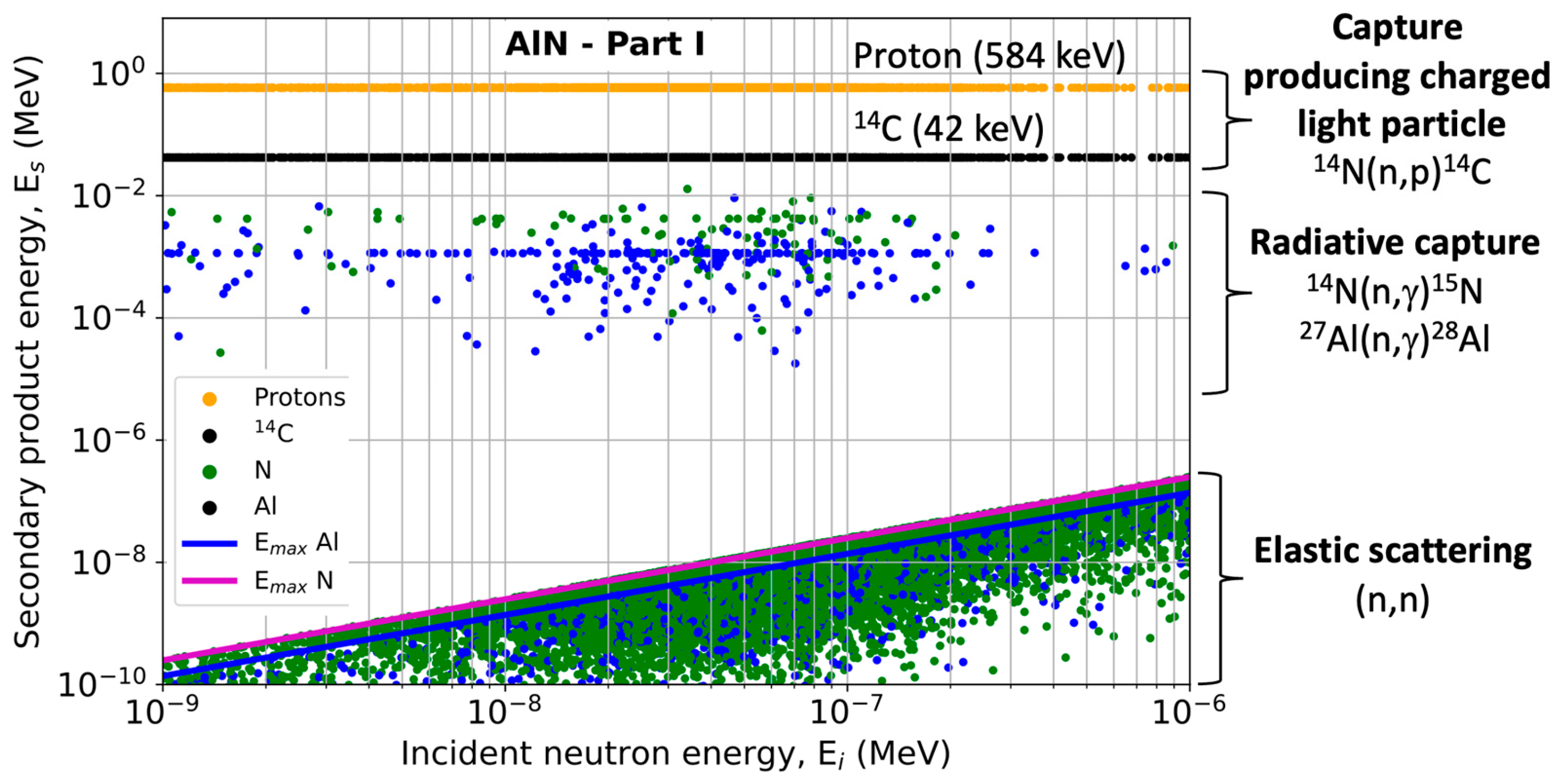 Energies of secondary products generated in the AlN target by interaction with neutrons from Part I of the atmospheric spectrum as a function of the incident neutron energy. The maximum energy of secondary products in elastic reactions, , as calculated using Equation (1) is also plotted for Al and N nuclei.