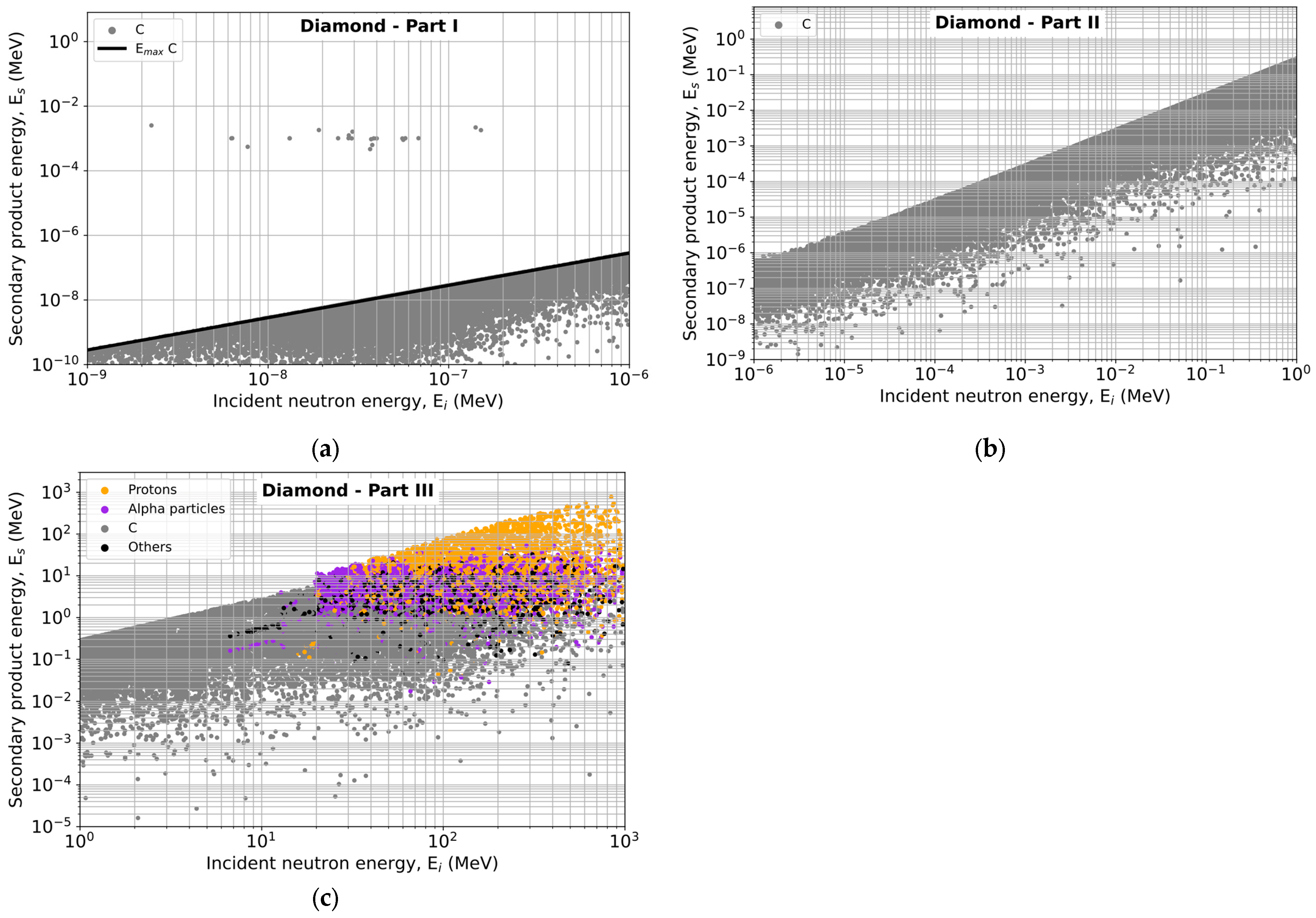 Energies of secondary products generated in the diamond target by interaction with neutrons from Parts I, II and III of the atmospheric spectrum as a function of the incident neutron energy: (a) Part I; the maximum energy of secondary products in elastic reactions, , as calculated using Equation (1) for carbon, is also plotted in this figure; (b) Part II; (c) Part III.