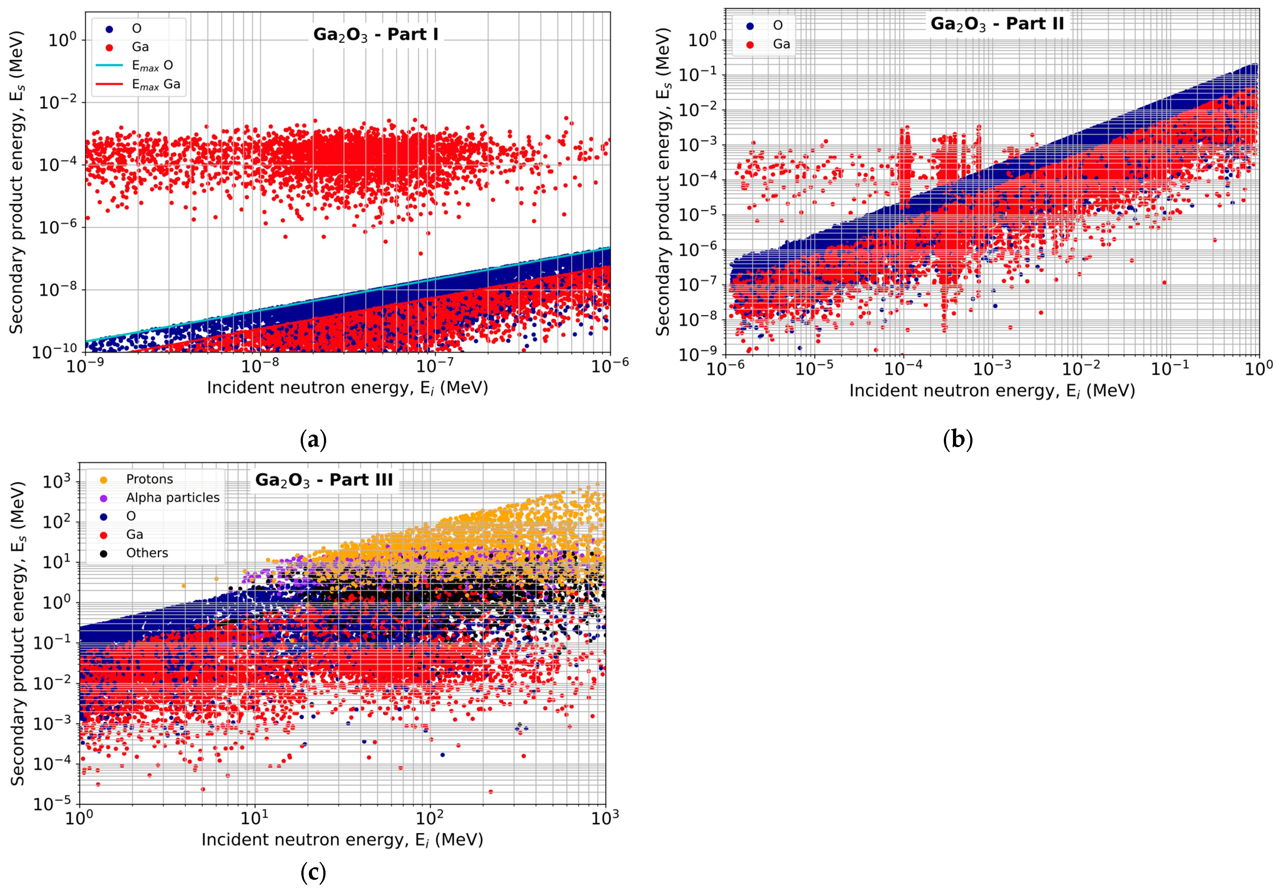 Energies of secondary products generated in the β-Ga2O3 target by interaction with neutrons from Parts I, II and III of the atmospheric spectrum as a function of the incident neutron energy: (a) Part I; the maximum energy of secondary products in elastic reactions, , as calculated using Equation (1) for O and Ga, is also plotted; (b) Part II; (c) Part III.
