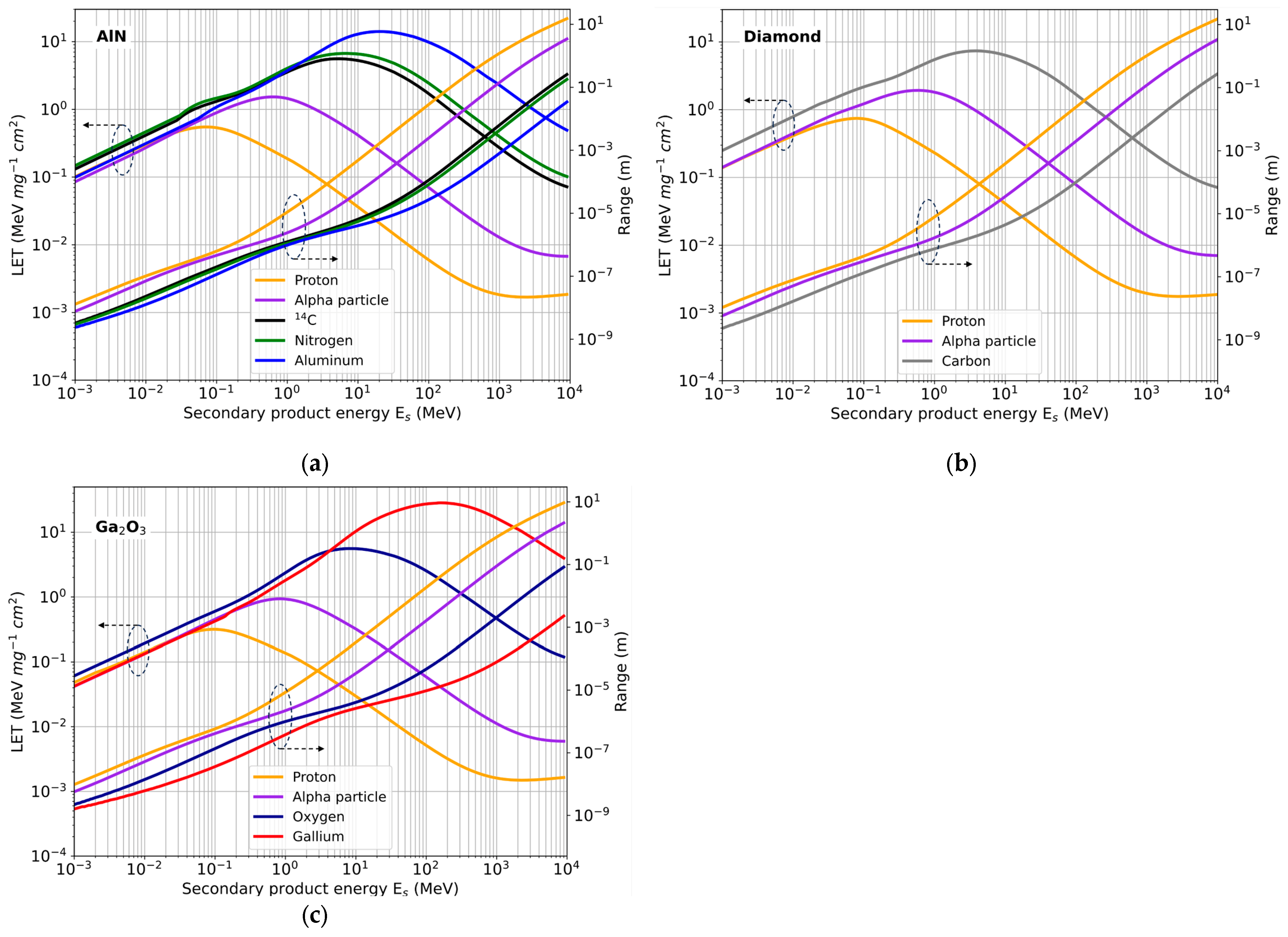 LET and range as a function of the secondary product energy for several secondary products in AlN, diamond and β-Ga2O3. (a) AlN; (b) Diamond; (c) β-Ga2O3.