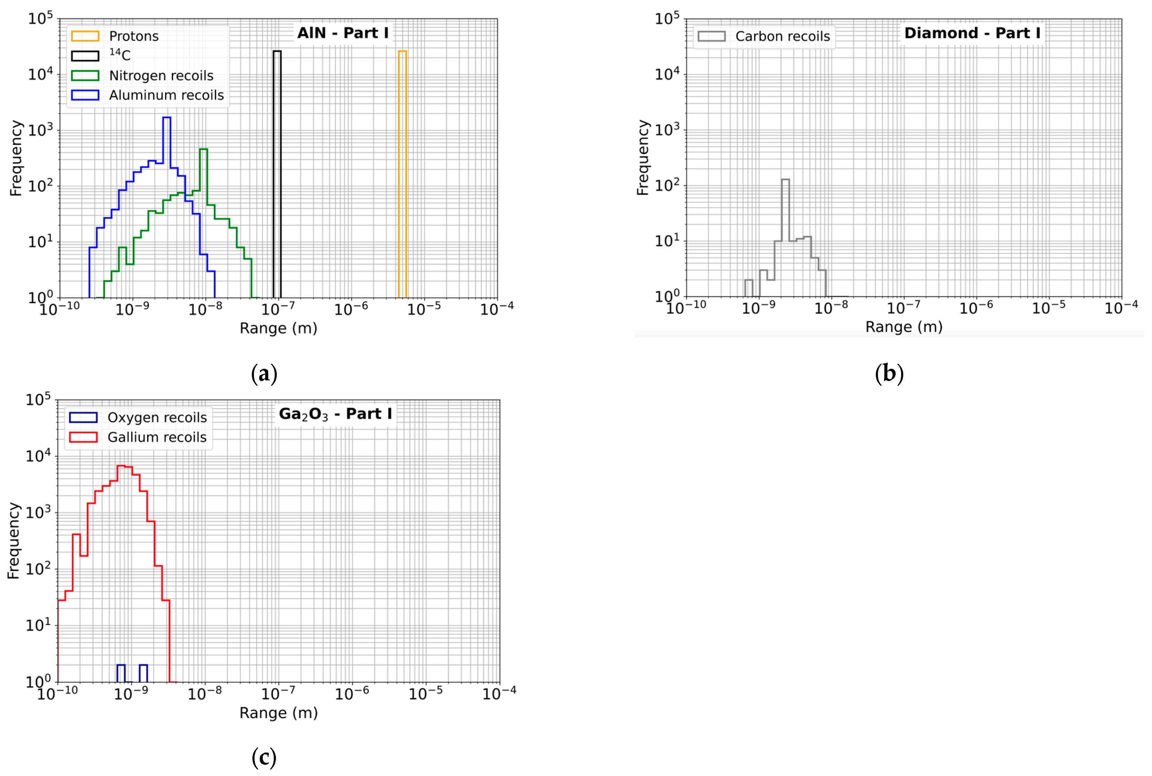 Range histograms for secondary products generated in the material targets by interactions of neutrons with energies in the Part I of the spectrum. (a) AlN; (b) Diamond; (c) β-Ga2O3.
