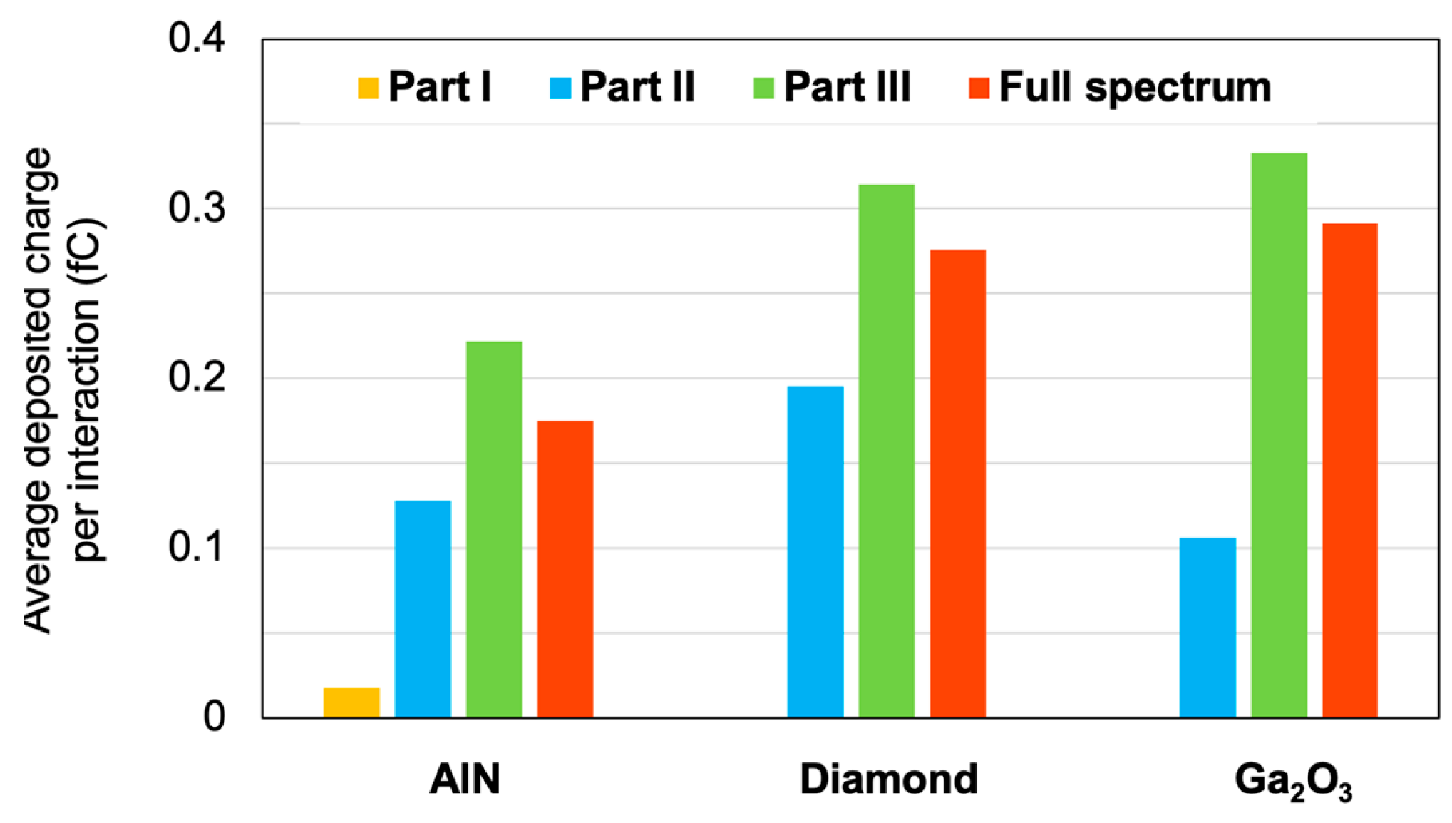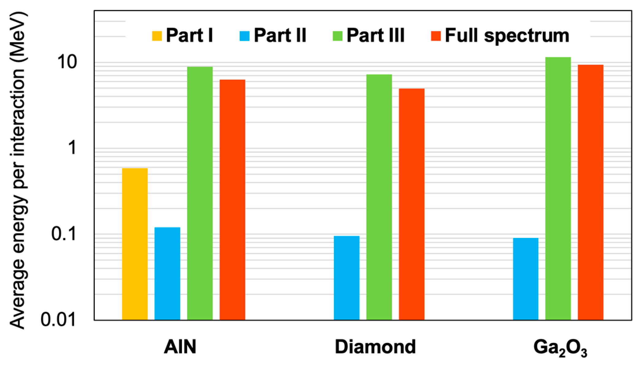 Average deposited energy per interaction for Parts I, II, III and the full spectrum by secondary products in AlN, diamond and β-Ga2O3 bulk targets. Only secondary products with initial energies above are considered in the estimation of this metric.
