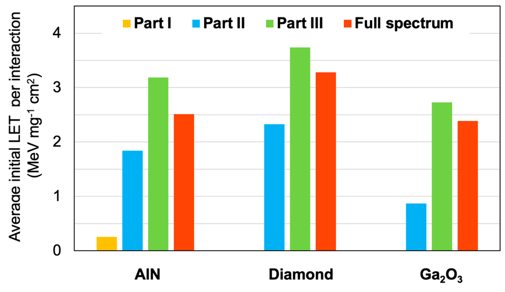 Average initial LET per interaction for Parts I, II, III and the full spectrum by secondary products in AlN, diamond and β-Ga2O3 bulk targets. Only secondary products with initial energies above are taken into account.