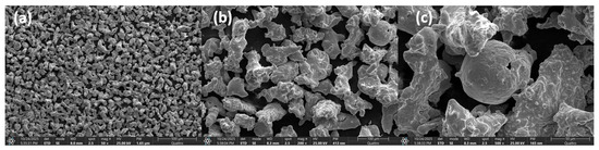 The coatings consisted of two types of powders, a metallic and a ceramic one. The metallic powder is commercially known as Metco 42C with the chemical composition Fe 17Cr 2Ni 0.18C and is martensitic, high chromium stainless steel powder similar to stainless steel type 431. The resulting coatings offer great wear and impact resistance in combination with the best corrosion resistance [15]. Metco 42C has particle sizes of −106 +45 µm and results in an irregular morphology, which can be sprayed in very thick layers. The morphological aspect of Metco 42C powders is represented in Figure 1.