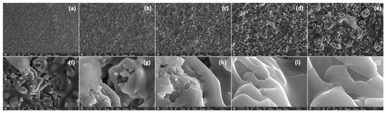 Morphological aspect of the metallic layer deposited with Metco 111. (a) 50×, (b) 100×, (c) 200×, (d) 500×, (e) 1000×, (f) 2000×, (g) 5000×, (h) 10,000×, (i) 50,000×, and (j) 100,000×.