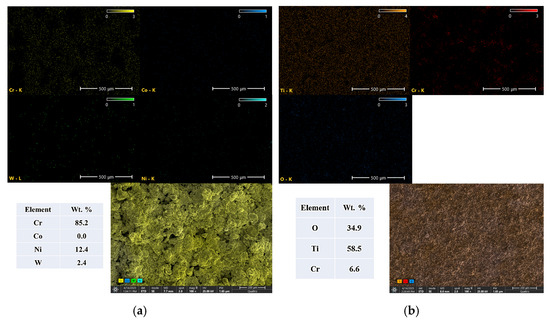 In Figure 8, both the elemental distribution maps and the quantity of identified elements are shown for the deposited surface. The wt% (weight percent) higher distribution can be observed in Figure 8a for the Cr element for Metco 42C powder. As can be observed in Figure 8b, for Metco 111 powder, a higher distribution of wt% (weight percent) was identified for the Ti element.