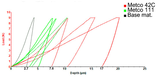 Microindentation graphs: red—Metco 42C, green—Metco 111, black—base material.