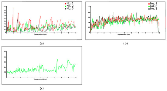 In Figure 12, the X–axis represents the variation of the COF value, the Y-axis represents the displacement length in units of millimeters for the traveling of the measurement device moving over a distance of 10 mm on the sample surface. During this movement, a linearly increasing force from 1 N to 10 N, at a speed of 0.167 mm/s.