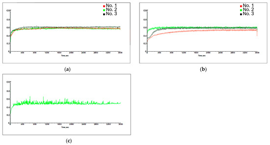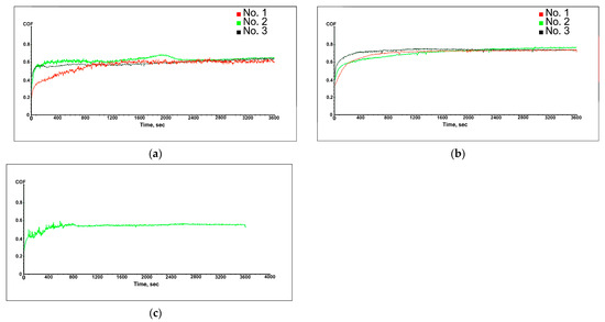 The resulting graphs are presented in Figure 16, where the X-axis represents the variation of COF values and the Y-axis represents the unit of time in seconds, regarding the duration of the friction rotational test on the surface of the test samples. Test parameters considered for the rotational movement over a defined time unit represented in the Y-axis are a loading force of 10 N applied on the measurement pin, at a rotational speed of the test sample of 60 RPM (revolutions per minute), which, in relation to the point of contact, corresponds to a peripheral speed of 125.66 mm/s.