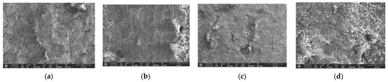 From the SEM images shown in Figure 15, we can observe that the peaks of asperities were removed and the particles are remaining on the sliding track, resulting in an abrasive behavior that leads to higher COF values. Comparing with base material results, coated samples are showing slightly improved COF values, which translates into improved wear resistance of coated samples.
