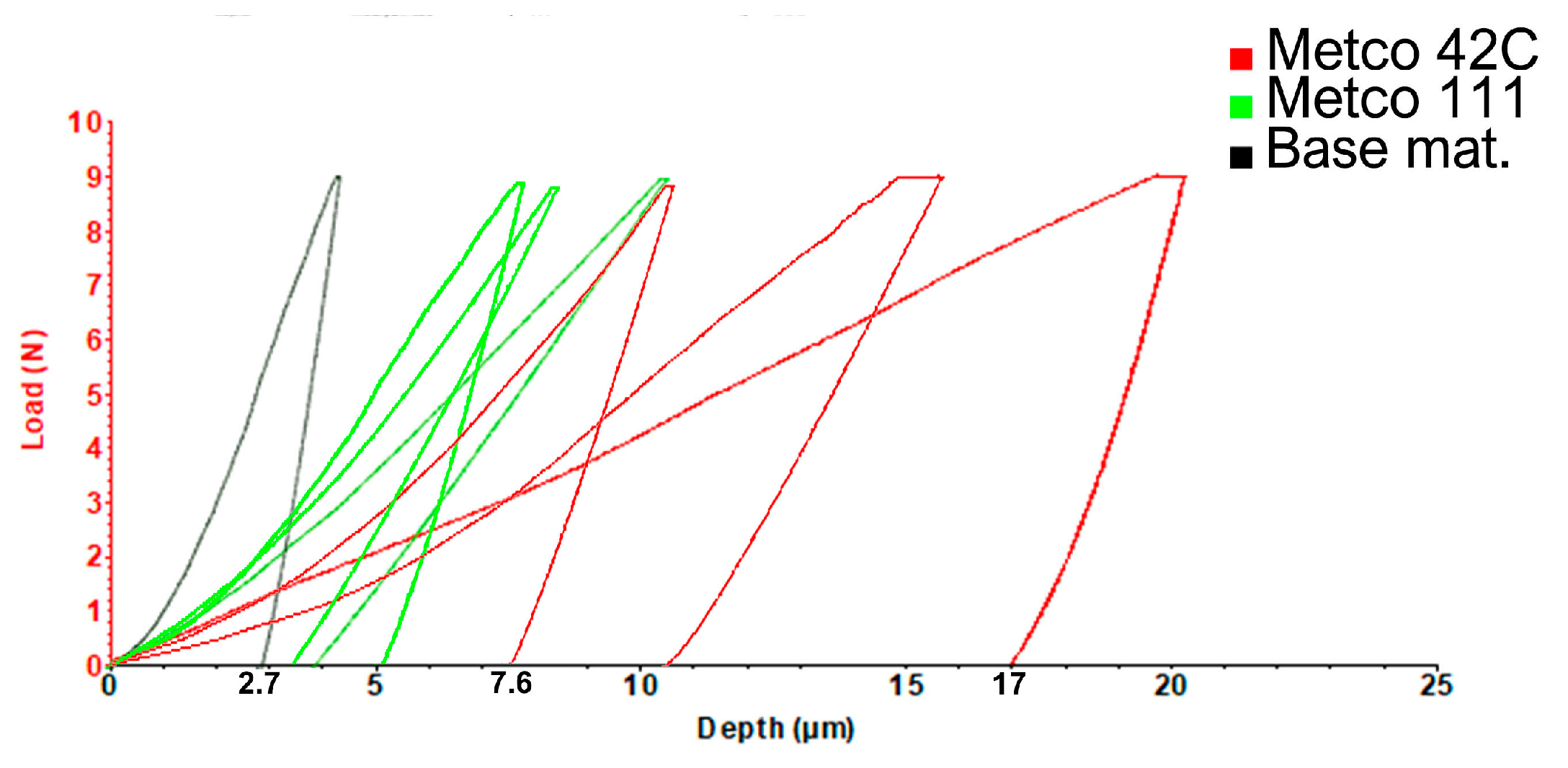 - Microindentation tests are showing that base material hardness achieved a value of 2.07 GPa, while Metco 111 samples achieved a maximum value of 1.25 GPa, the lowest value being achieved by Metco 42C, with a maximum value of 0.72 GPa. Therefore, the recommended layer for the highest improvement of hardness properties of coated surfaces is achieved with Metco 111 ceramic powder.