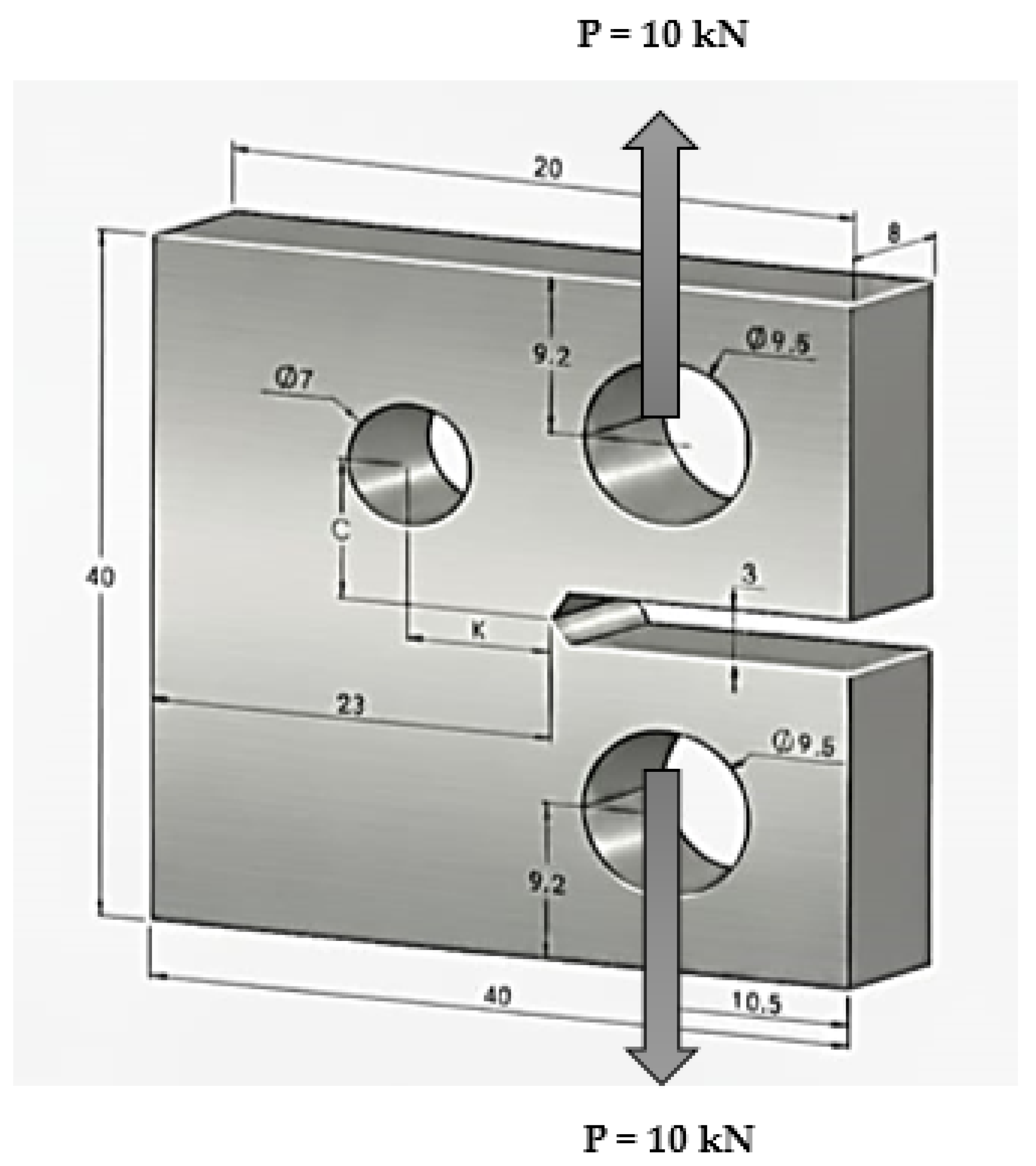 - Fageehi, Y.A.; Alshoaibi, A.M. Investigating the Influence of Holes as Crack Arrestors in Simulating Crack Growth Behavior Using Finite Element Method. Appl. Sci. 2024, 14, 897. [Google Scholar] [CrossRef]