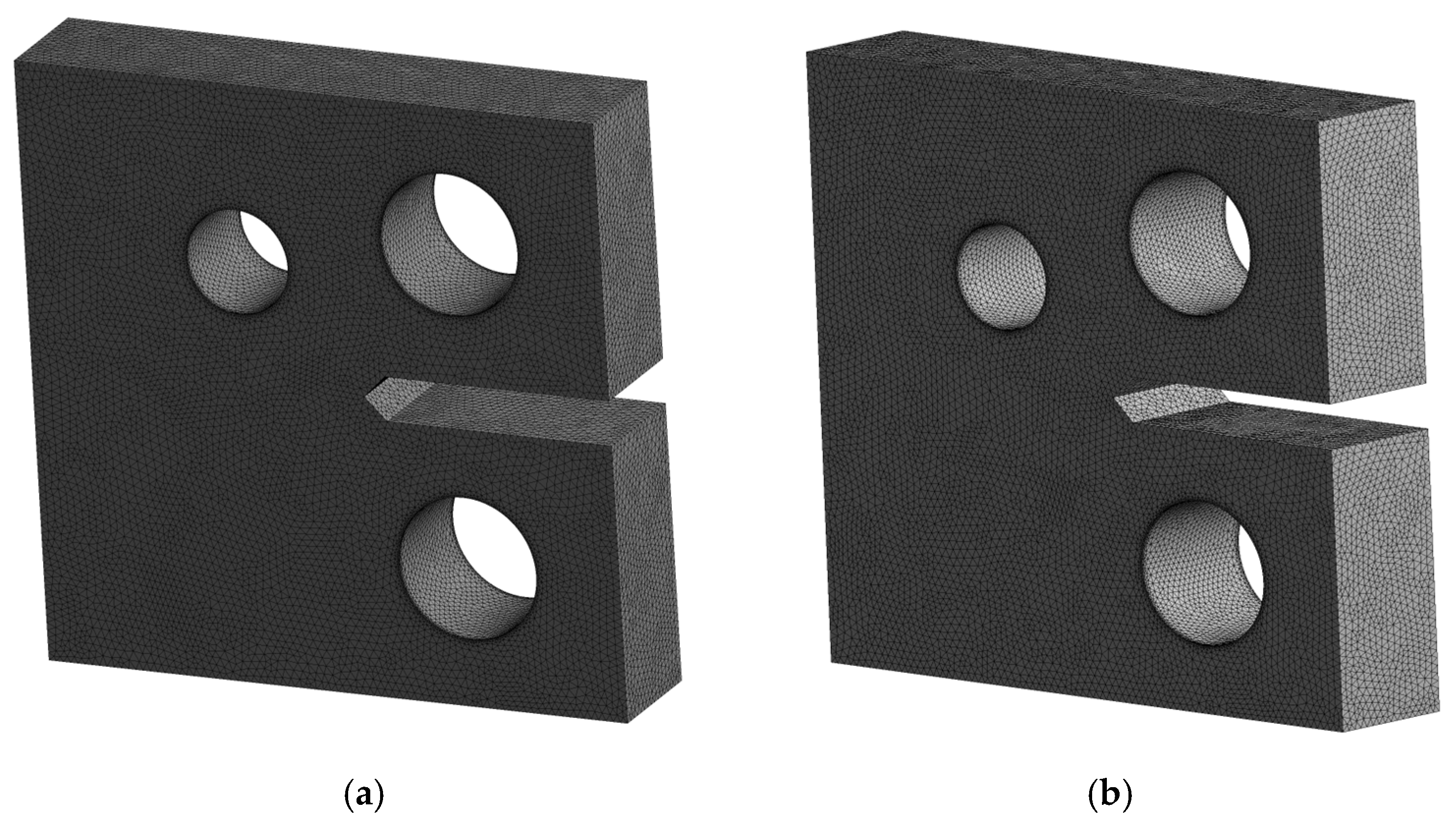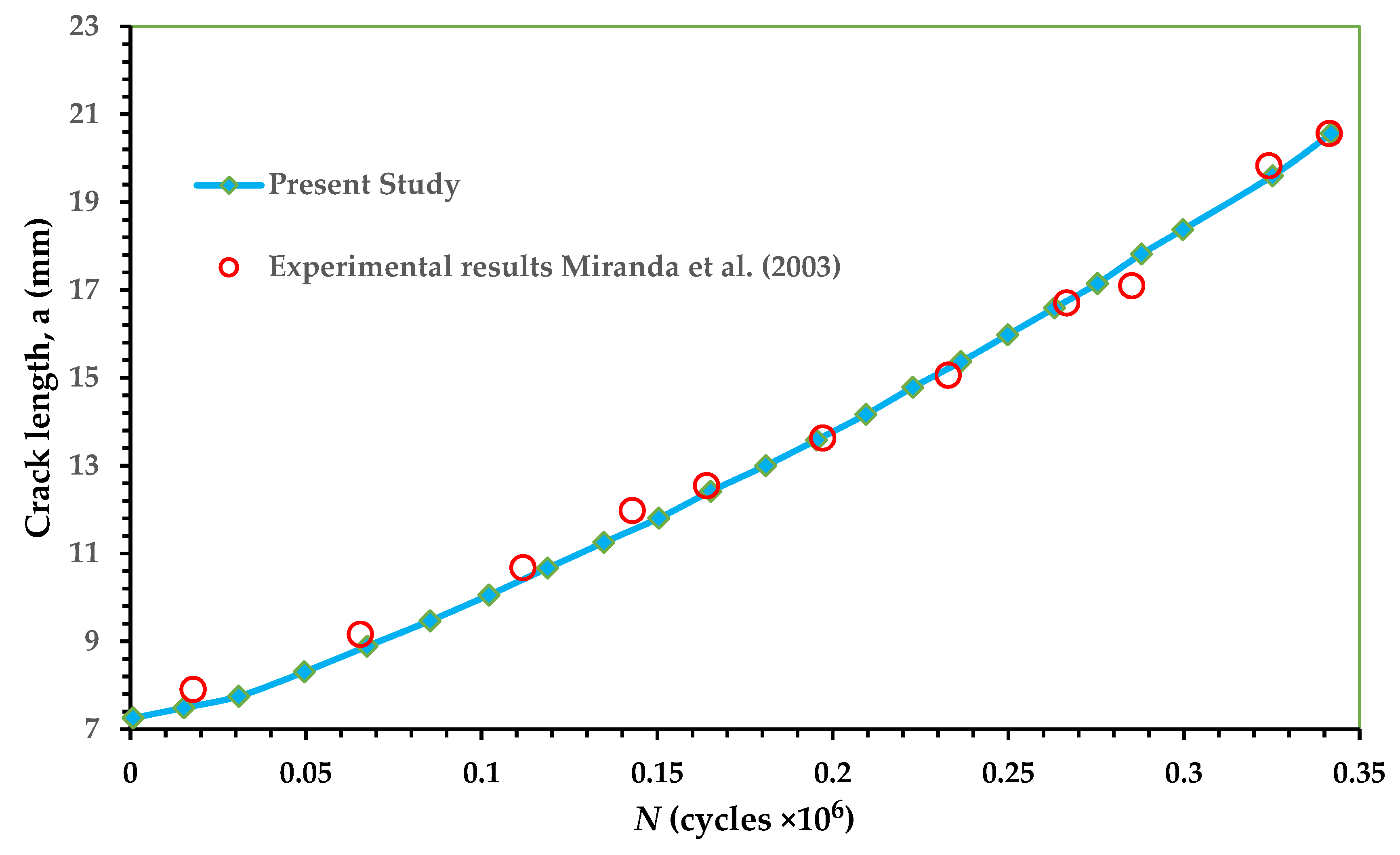 - Fageehi, Y.A.; Alshoaibi, A.M. Comparative Finite Element Analysis of Fatigue Crack Growth in High-Performance Metallic Alloys: Influence of Material Parameters and Paris Law Constants. Crystals 2025, 15, 801. [Google Scholar] [CrossRef]