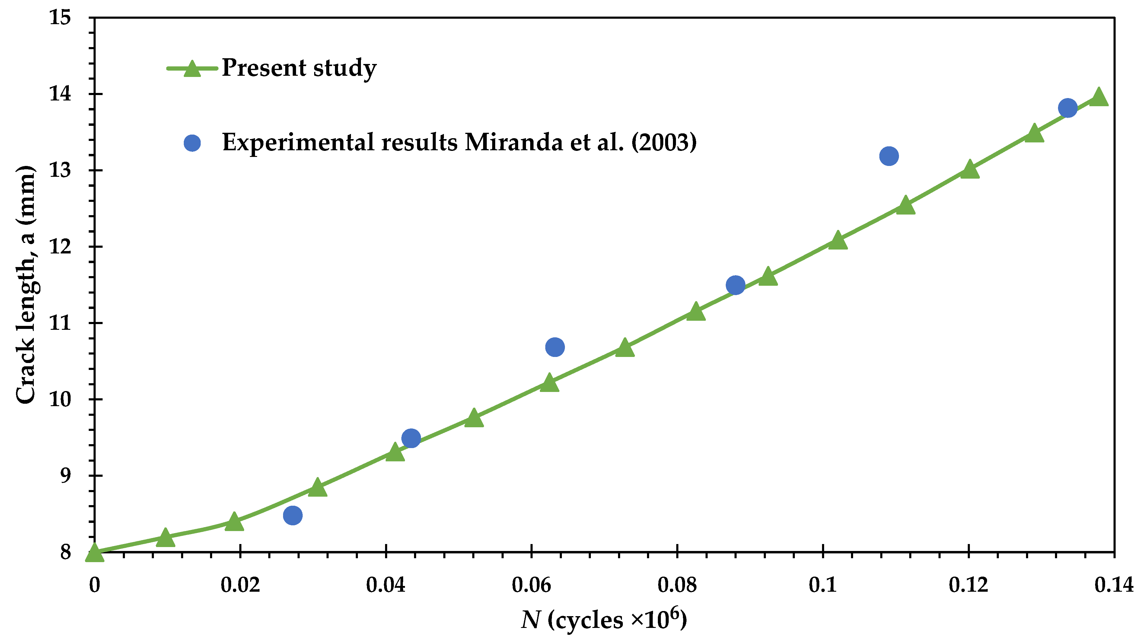 - Miranda, A.; Meggiolaro, M.; Castro, J.; Martha, L.; Bittencourt, T. Fatigue life and crack path predictions in generic 2D structural components. Eng. Fract. Mech. 2003, 70, 1259–1279. [Google Scholar] [CrossRef]
