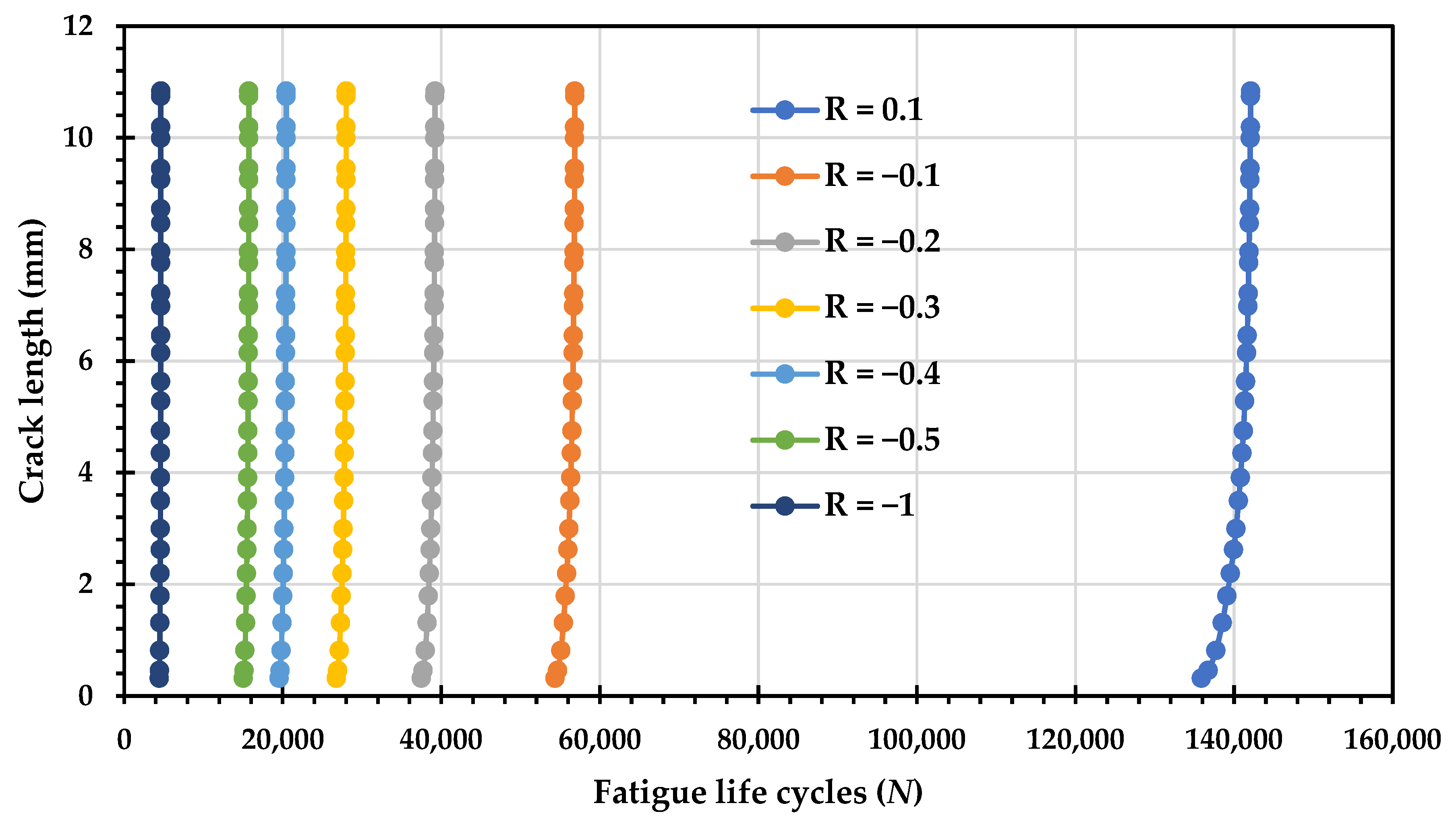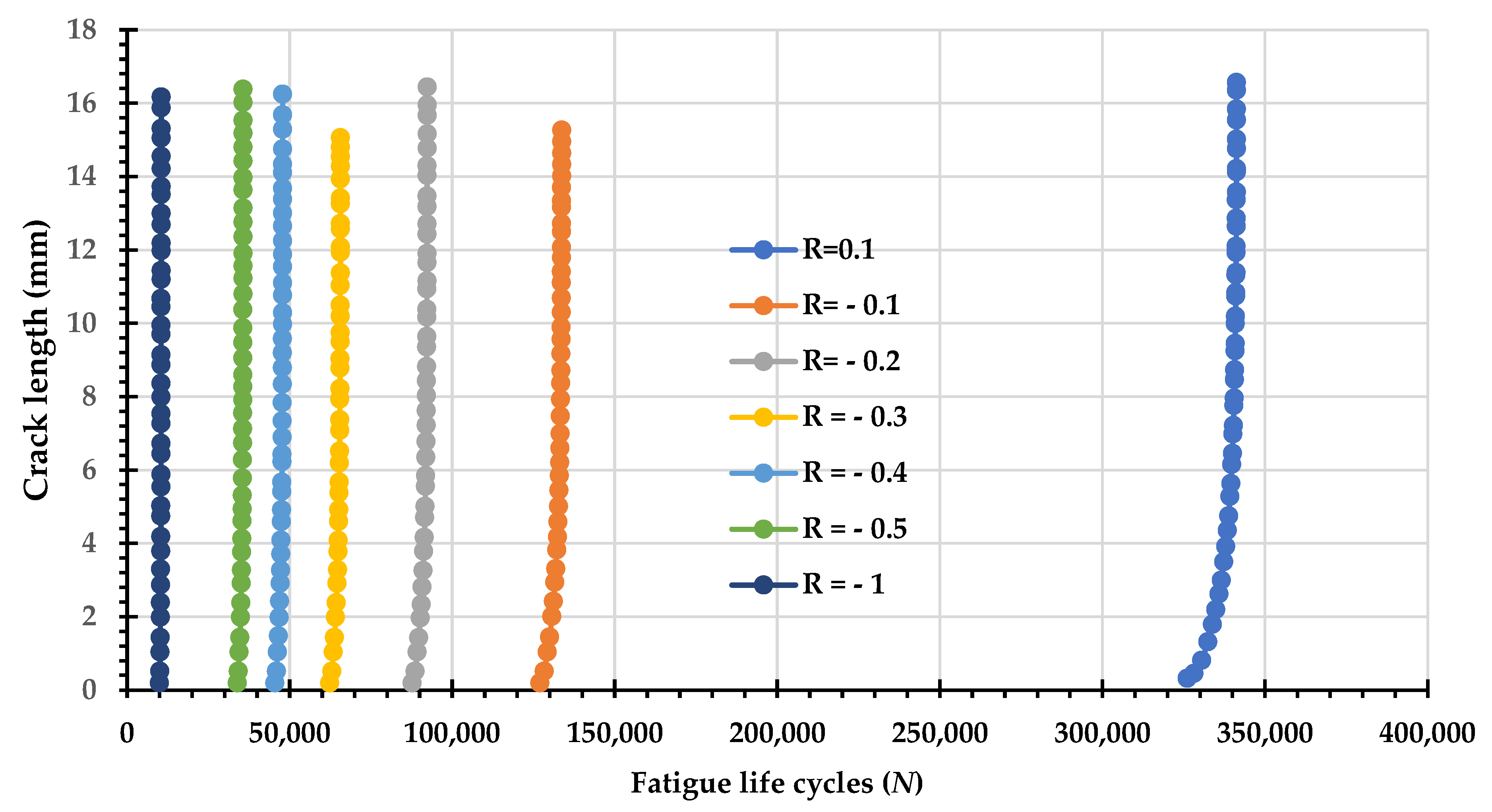 - The results confirm that the presence of a compressive load component fundamentally alters the FCG kinetics. A clear inverse relationship was established between the magnitude of the negative stress ratio and the predicted fatigue life cycles, highlighting the necessity of accounting for the increased tensile mean stress effect associated with these loading condition. The simulation successfully captured the expected inverse correlation between the magnitude of the negative stress ratio and the component’s fatigue life cycles, validating the computational model’s predictive capability under challenging loading conditions.