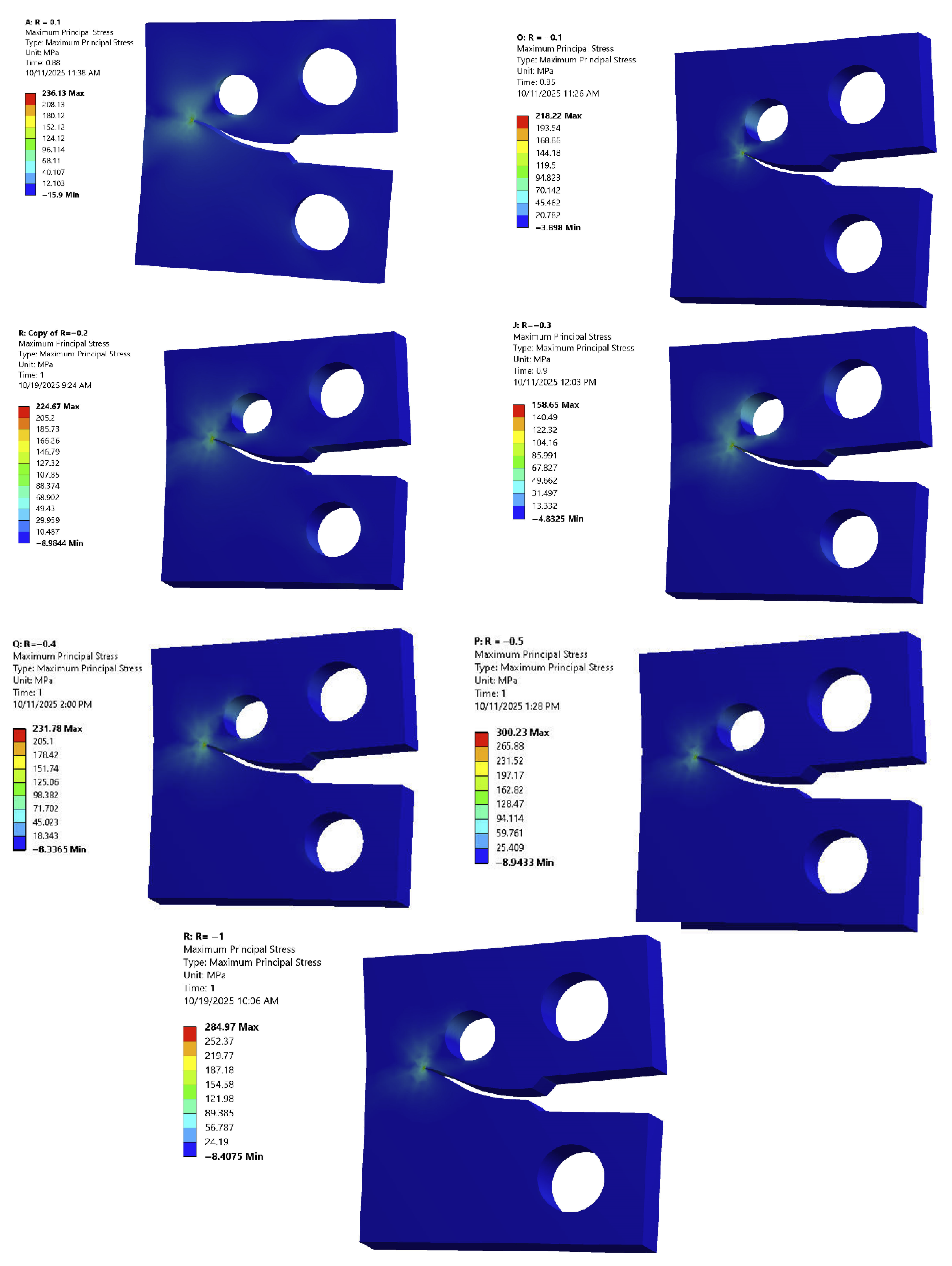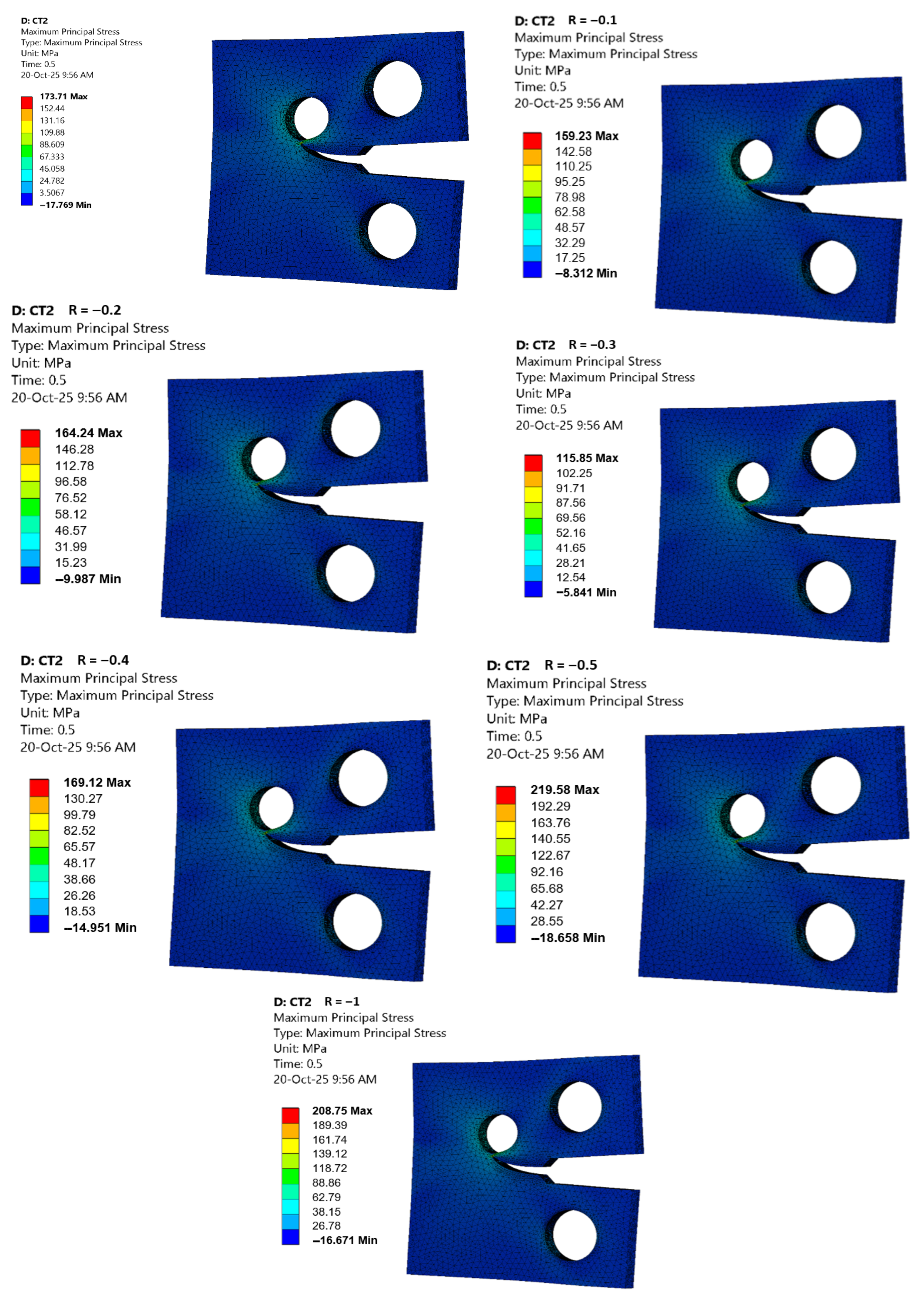 | Stress Ratio (R) | Maximum Principal Stress (MPa), CT1 | Maximum Principal Stress (MPa), CT2 |