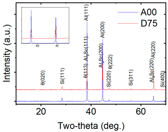 As shown in Figure 4, the XRD patterns of alloys A00 and D75 reveal differences in phase composition. Alloy A00 primarily consists of Al and Si phases, with a small amount of the θ-Al2Cu phase. In addition to these phases, alloy D75 also contains detectable amounts of the Al3Sc phase.