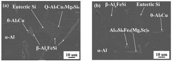 As shown in Figure 5, the SEM micrographs of alloy A00 and alloy D75 reveal typical microstructural features of an Al-Si hypereutectic alloy. In addition to the primary α-Al grains, the microstructure of the alloy also reveals the presence of eutectic Si, the θ-Al2Cu intermetallic phase, and various Fe-rich phases, which are commonly distributed along the grain boundaries and in the intermetallic regions.